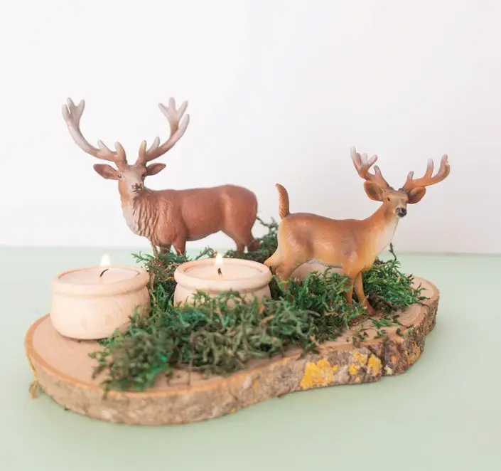 - Cómo montarlo: Usa una rodaja grande como «plaza del pueblo». Coloca en el centro una casita de madera con ventanas. Dentro, pon una vela LED (nunca una llama real dentro de la casa) para que la luz ilumine las ventanas. Rodéala con musgo seco y un arbolito mini de madera.
