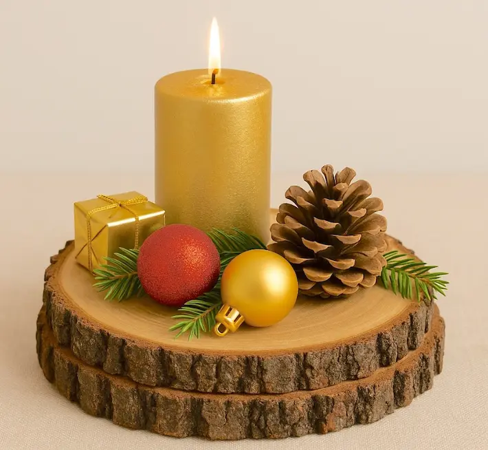 - Cómo montarlo: Sobre una bandeja de madera de líneas rectas (o una rodaja grande), coloca velas altas y muy finas en portavelas metálicos (dorados o negros). No añadas nada más, excepto quizás una única piña grande pintada de dorado o negro mate. El contraste entre la madera natural y el metal pulido es pura elegancia.