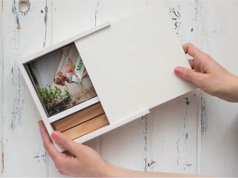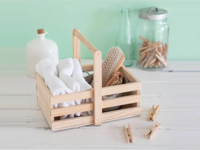 En lugar de una cesta abierta, apuesta por un maletín de madera robusto y elegante.