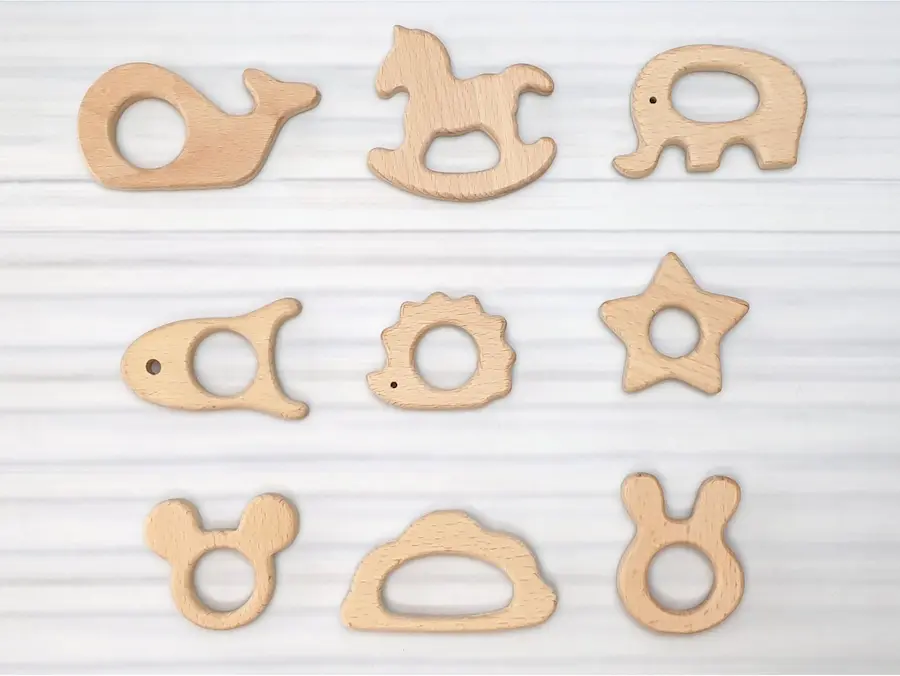 Antes de que lleguen los grandes juegos, el bebé necesita explorar texturas. Los mordedores de madera son la alternativa perfecta al plástico.