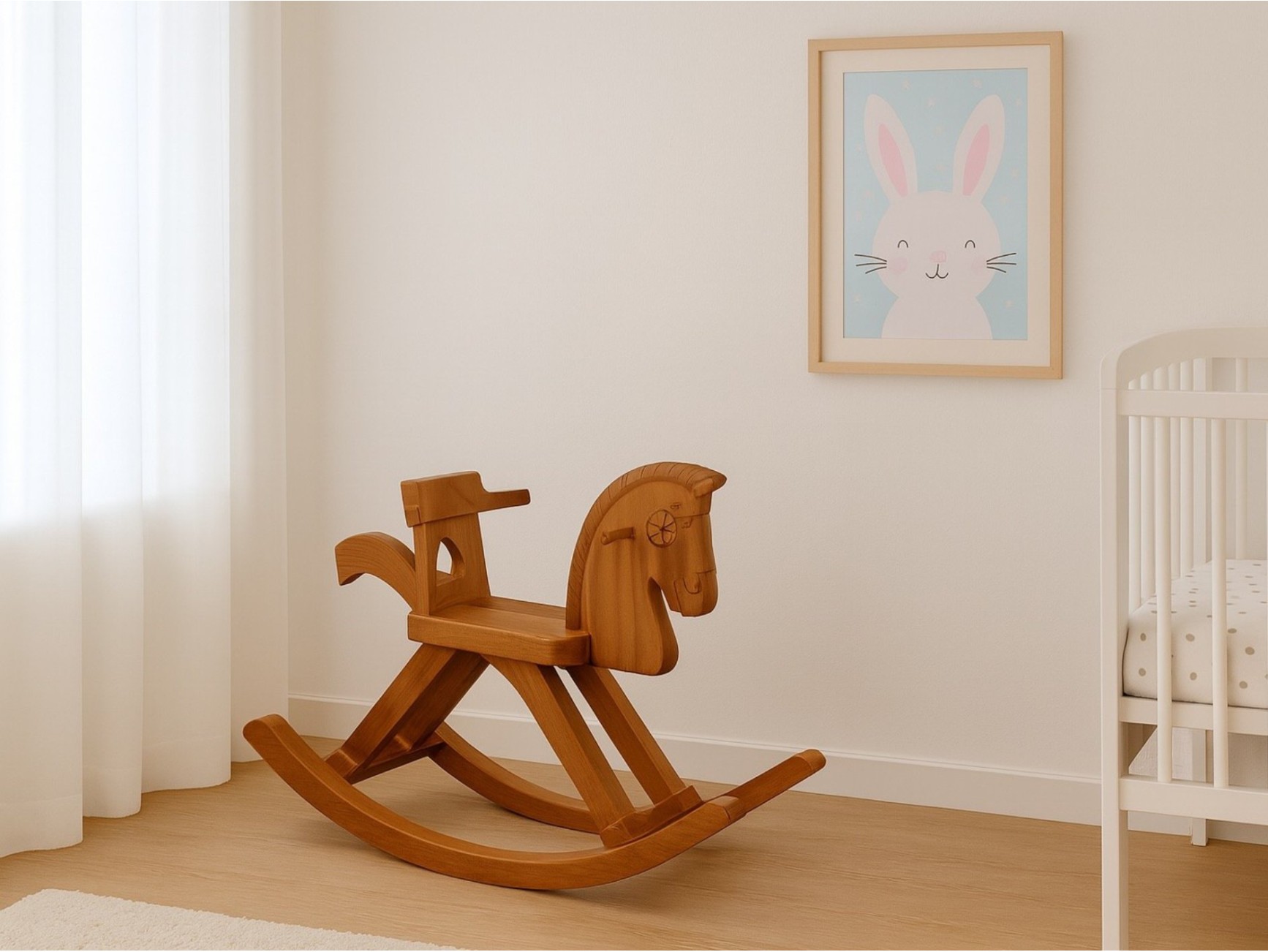 Añade un toque cálido, natural y nostálgico con este caballito balancín de madera, una pieza única que encantará tanto a niños como a adultos.