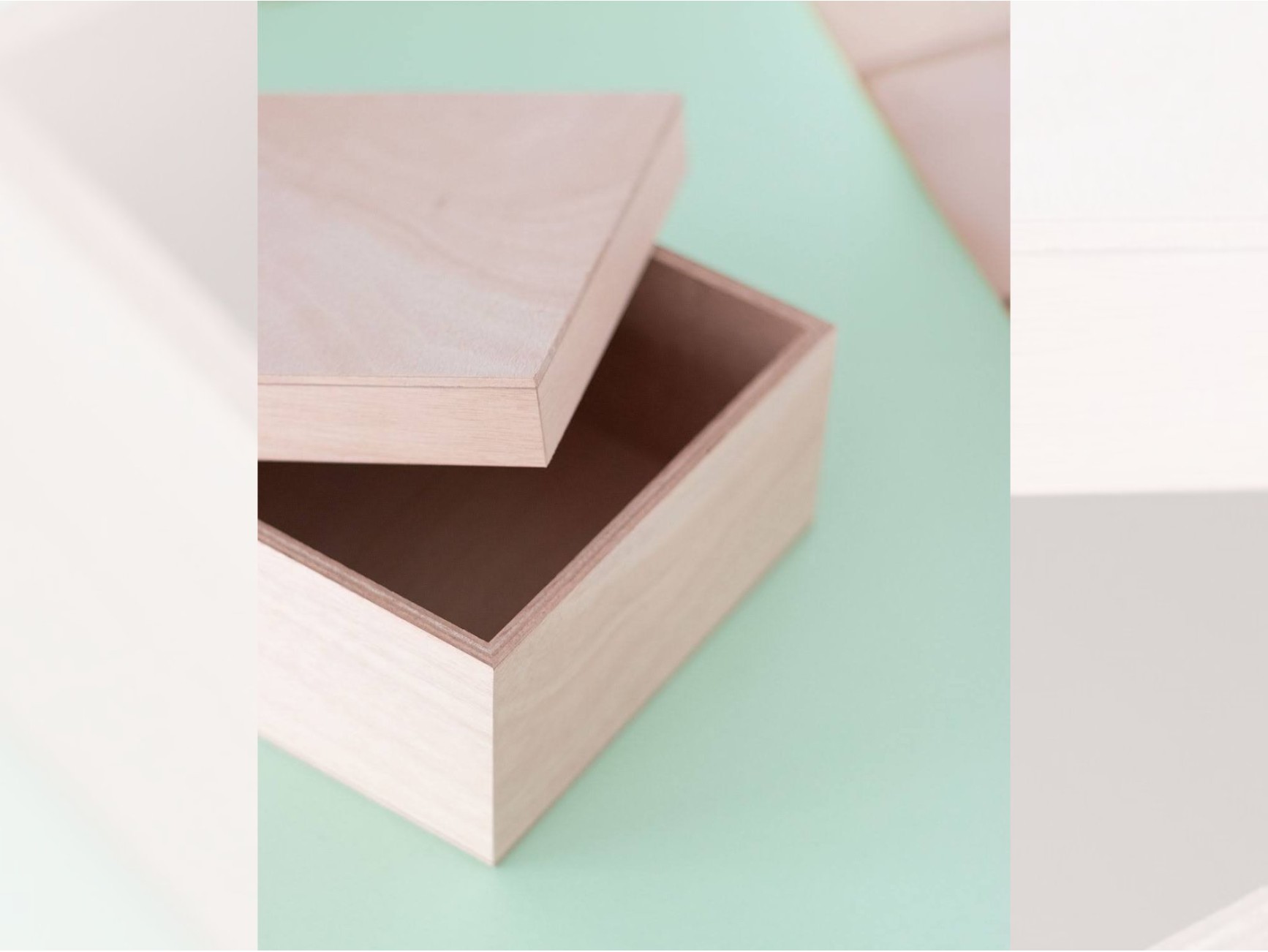 Caja de madera con bisagras y tapa recortada con forma ondulada. Sus 6 divisiones interiores son extraibles.