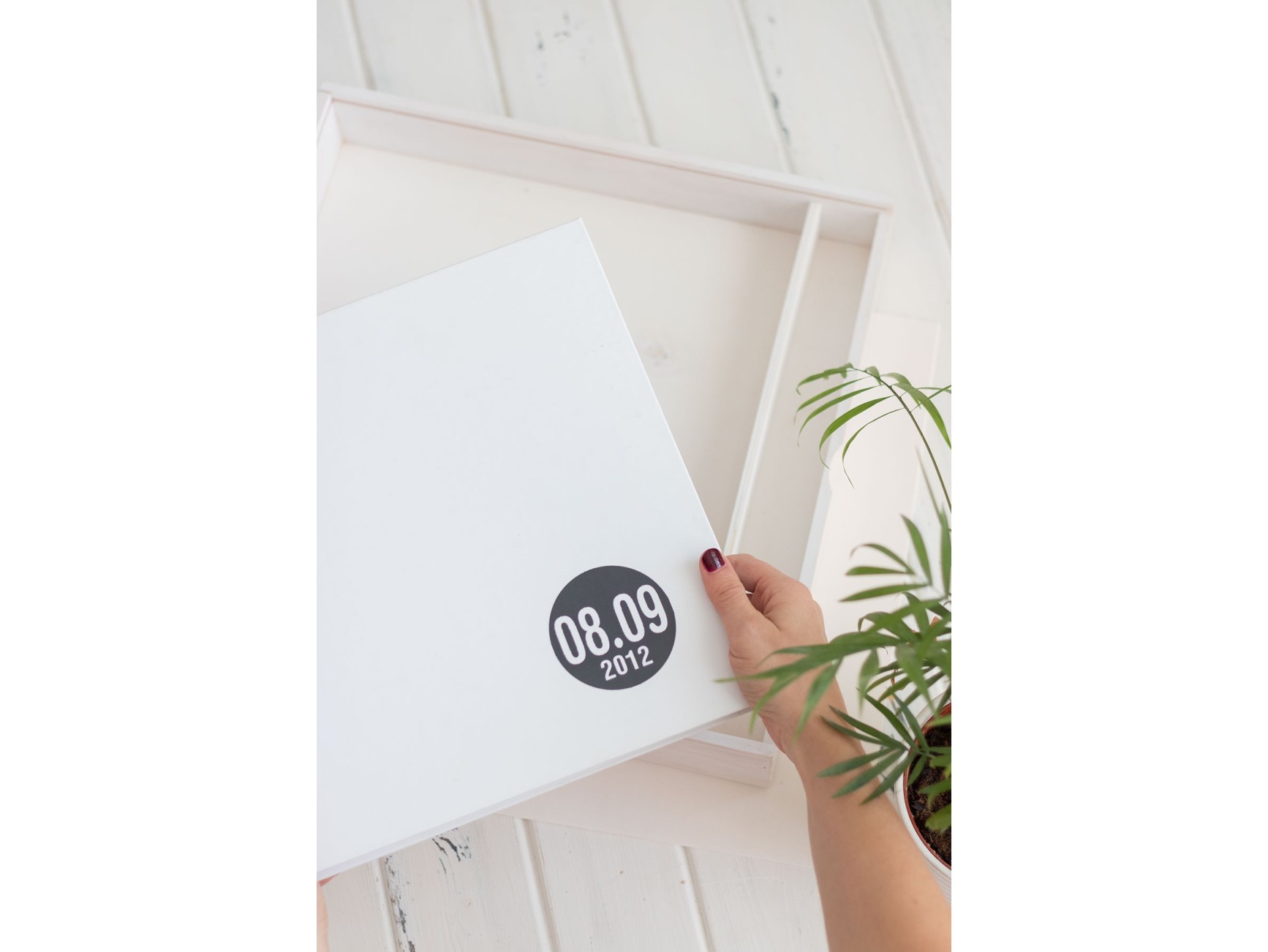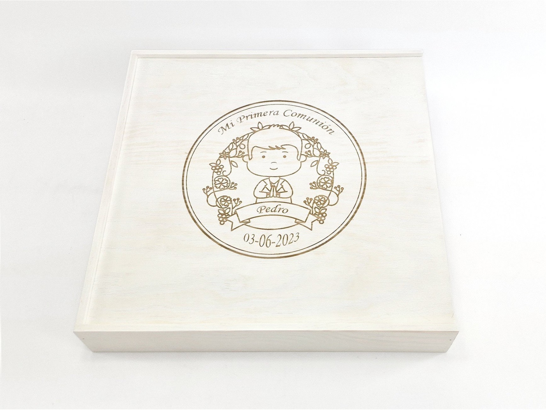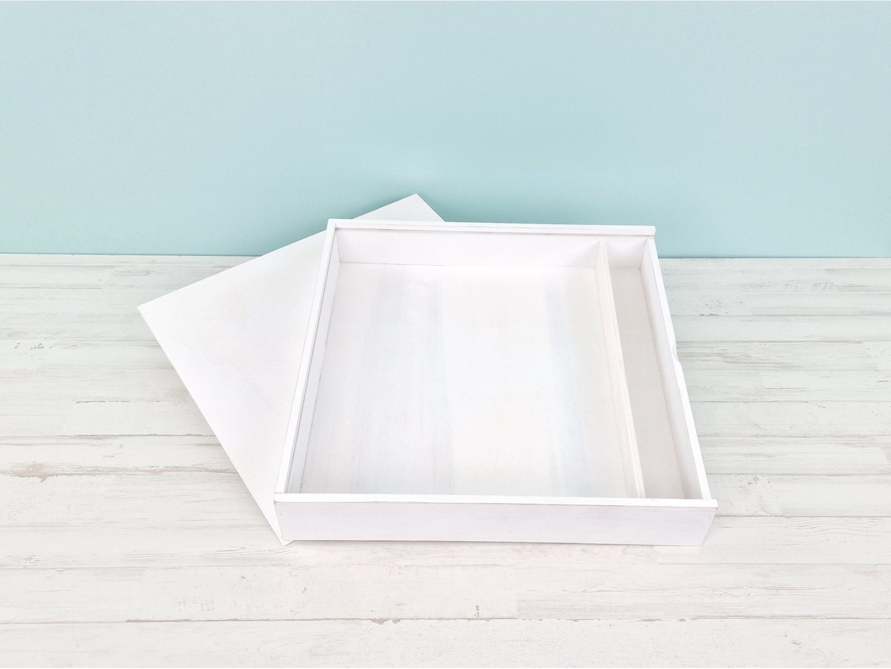 Caja de madera blanca, diseñada especialmente para álbumes de 30x30 cm. Cuenta con tapa corredera de madera y una práctica división interior para incluir un PenDrive, ideal para entregar copias digitales junto al álbum físico.