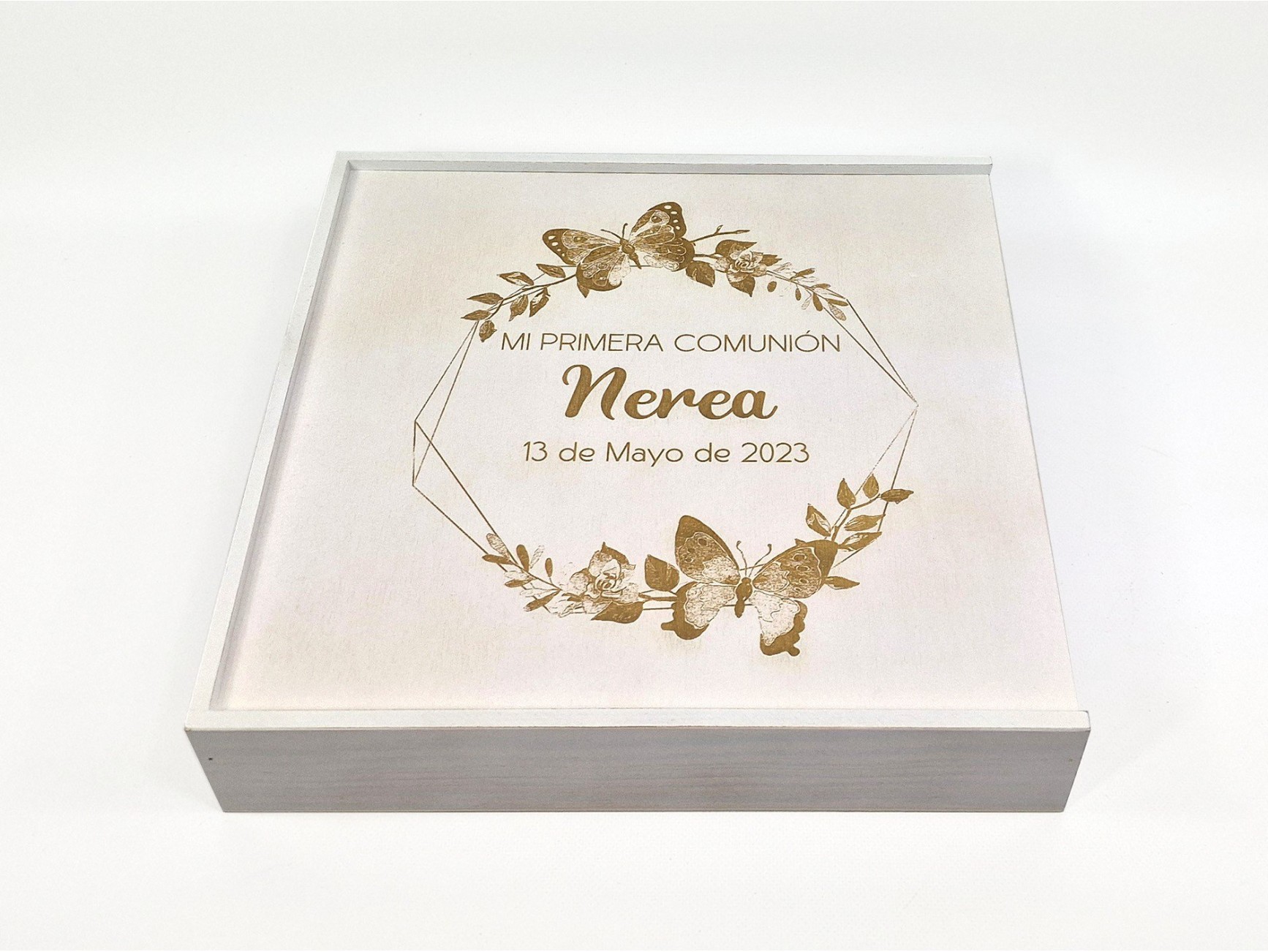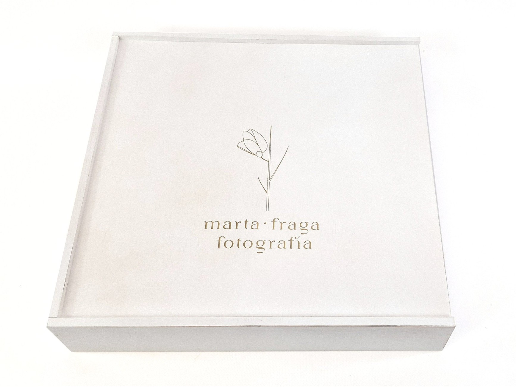 Caja de madera en color blanco con tapa corredera de madera, diseñada para presentar y proteger tu álbum de fotos de forma elegante y segura. Su acabado limpio y minimalista la convierte en la opción perfecta para reportajes de boda, sesiones familiares o cualquier ocasión especial.