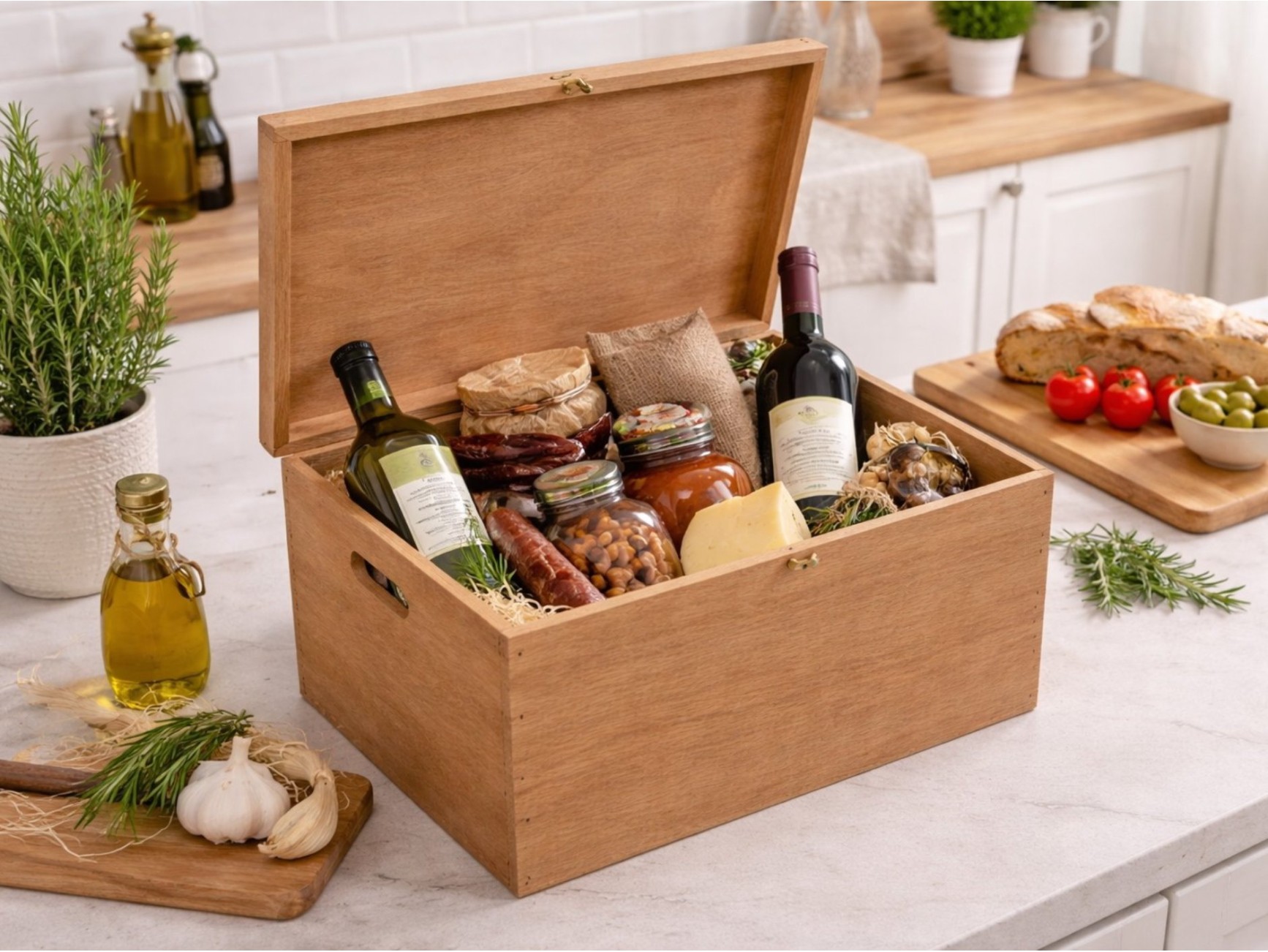 Perfecta para incluir vinos, conservas, embutidos, dulces o productos artesanales. La madera natural realza el valor del contenido y transmite calidad. Amplia, robusta y con gran capacidad de almacenamiento.