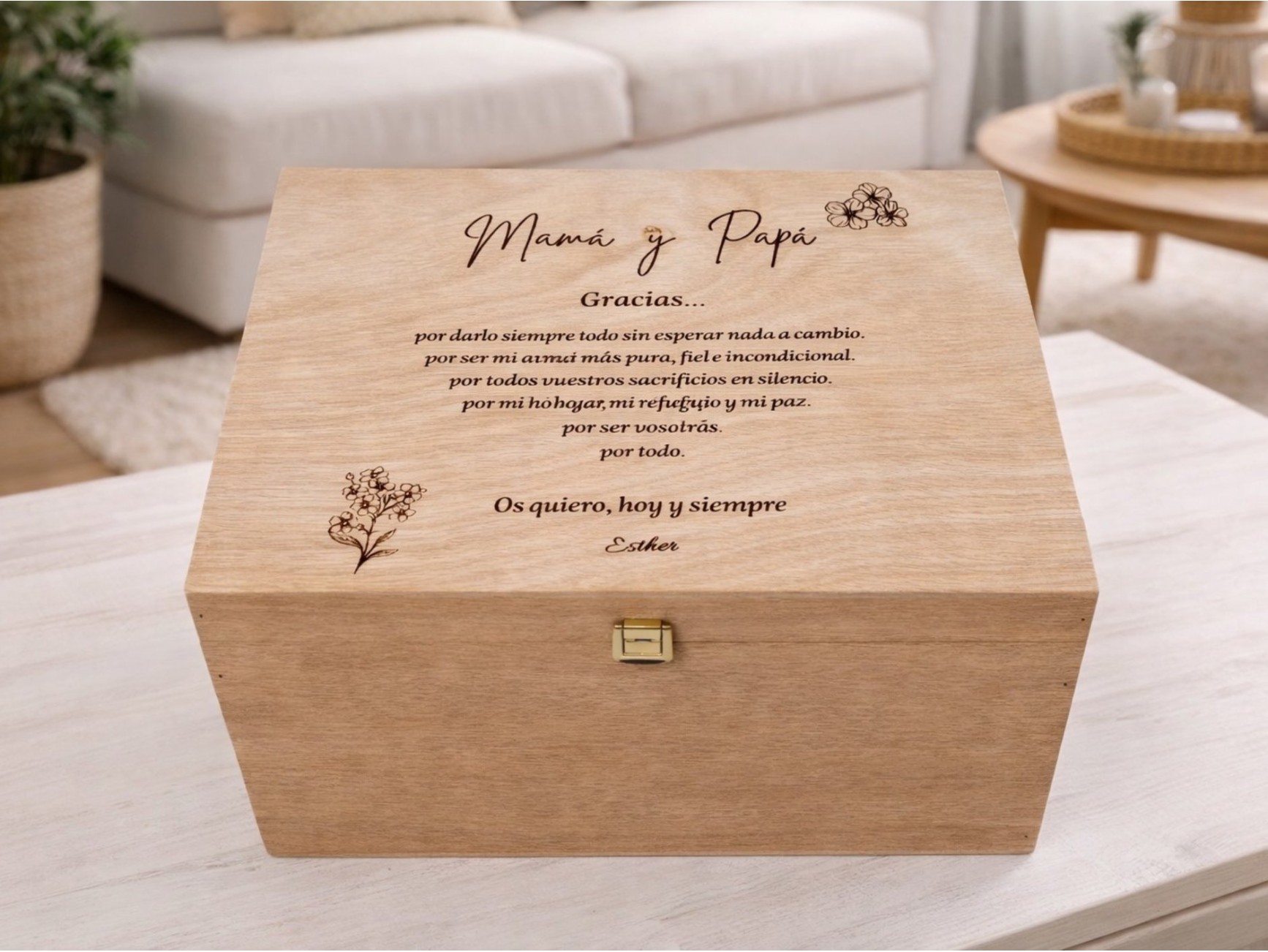 Fabricada en madera natural de okume, cuenta con bisagras resistentes, cierre seguro y asas laterales que facilitan un transporte cómodo. Su diseño atemporal encaja en cualquier estilo decorativo.
