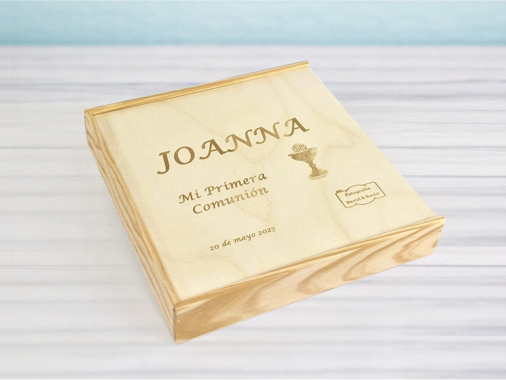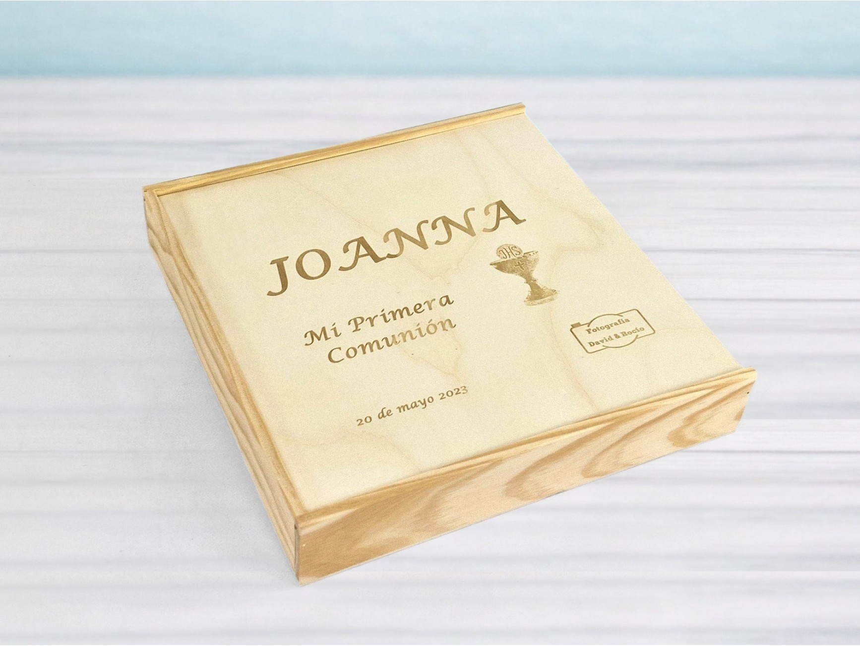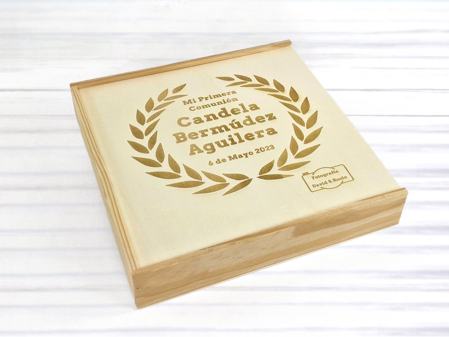Caja de madera natural con tapa corredera de Metacrilato de 4 mm. y división interior para PenDrive.