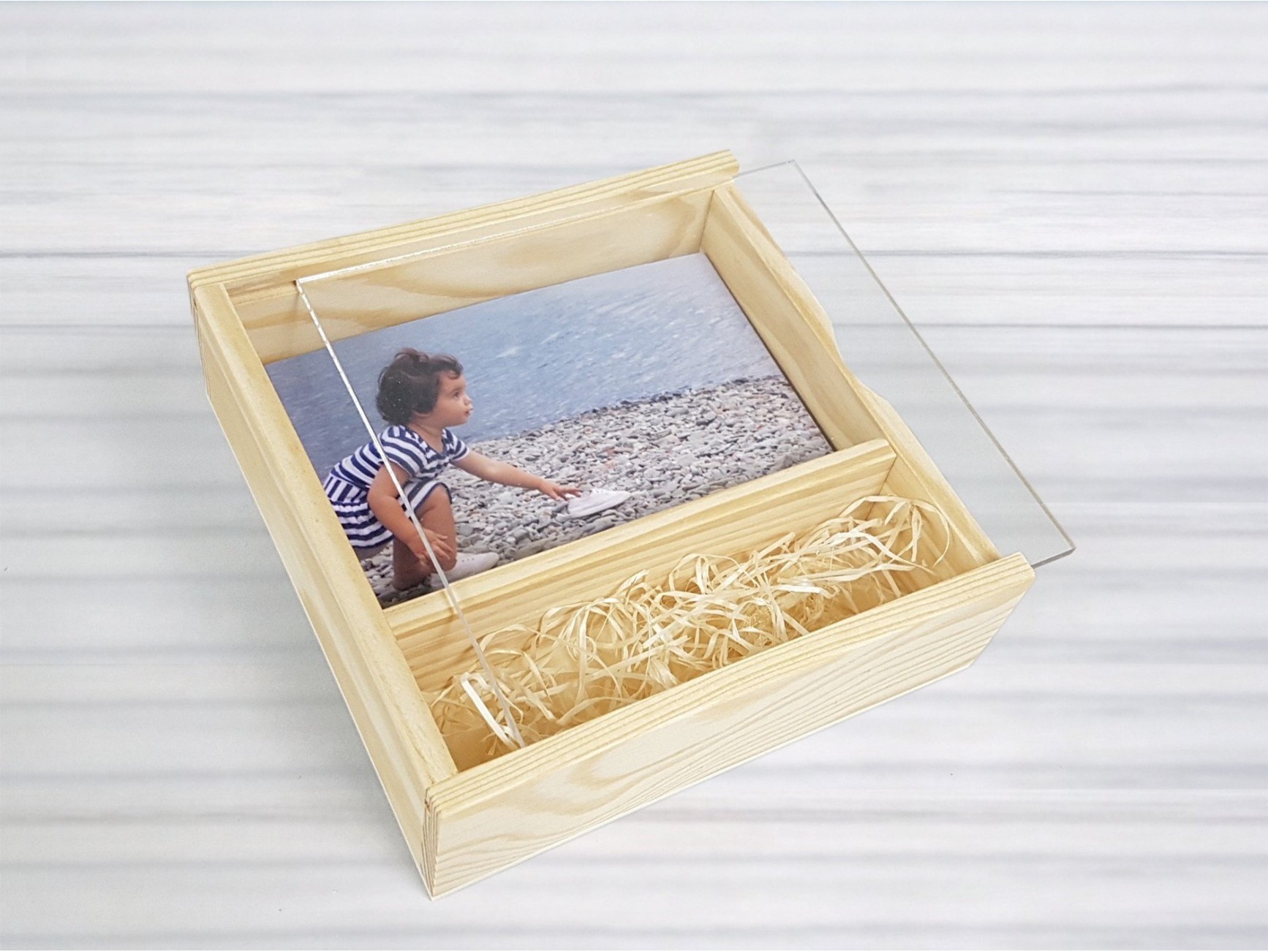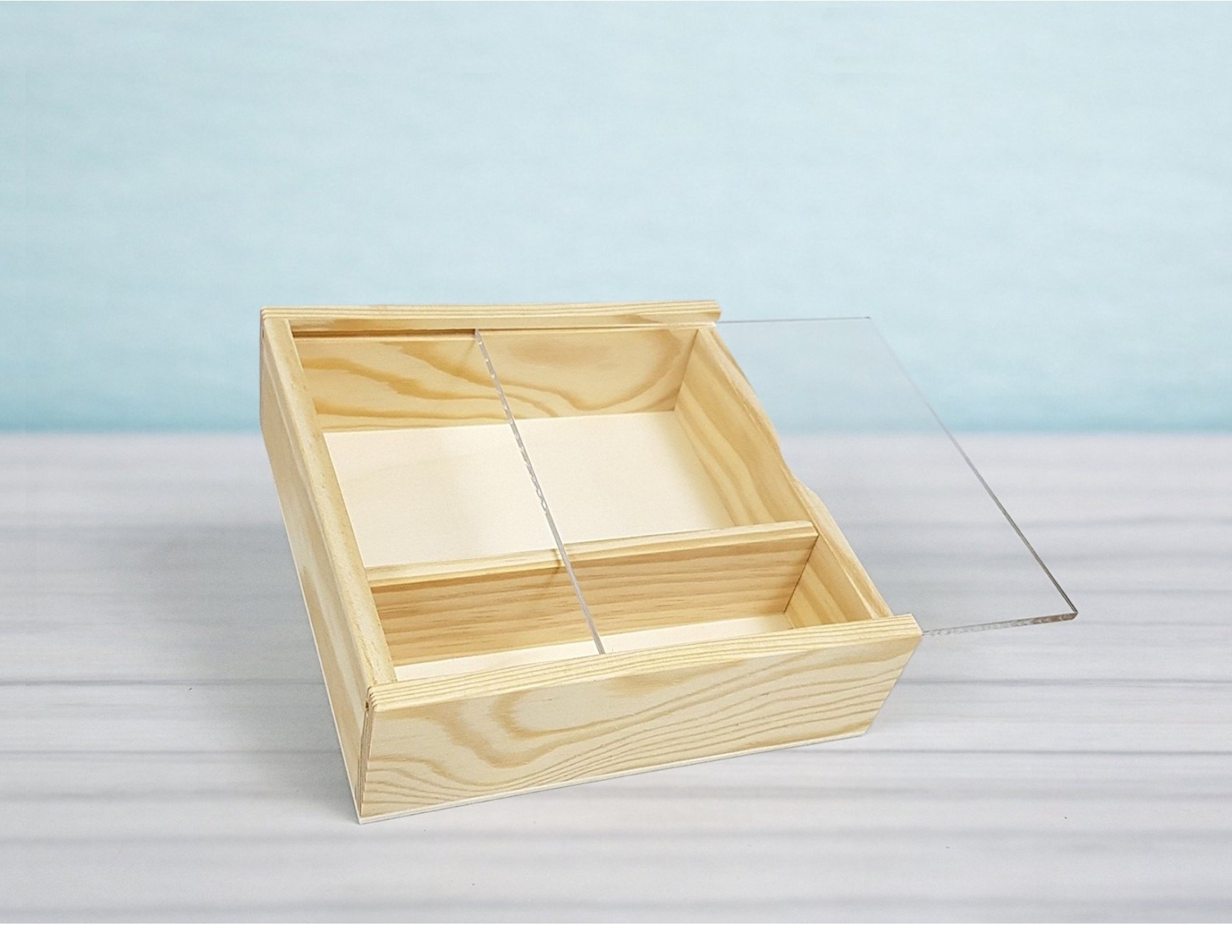 Cajas de madera fabricada en madera de pino con tapa de metacrilato. No tiene divisiones interiores.