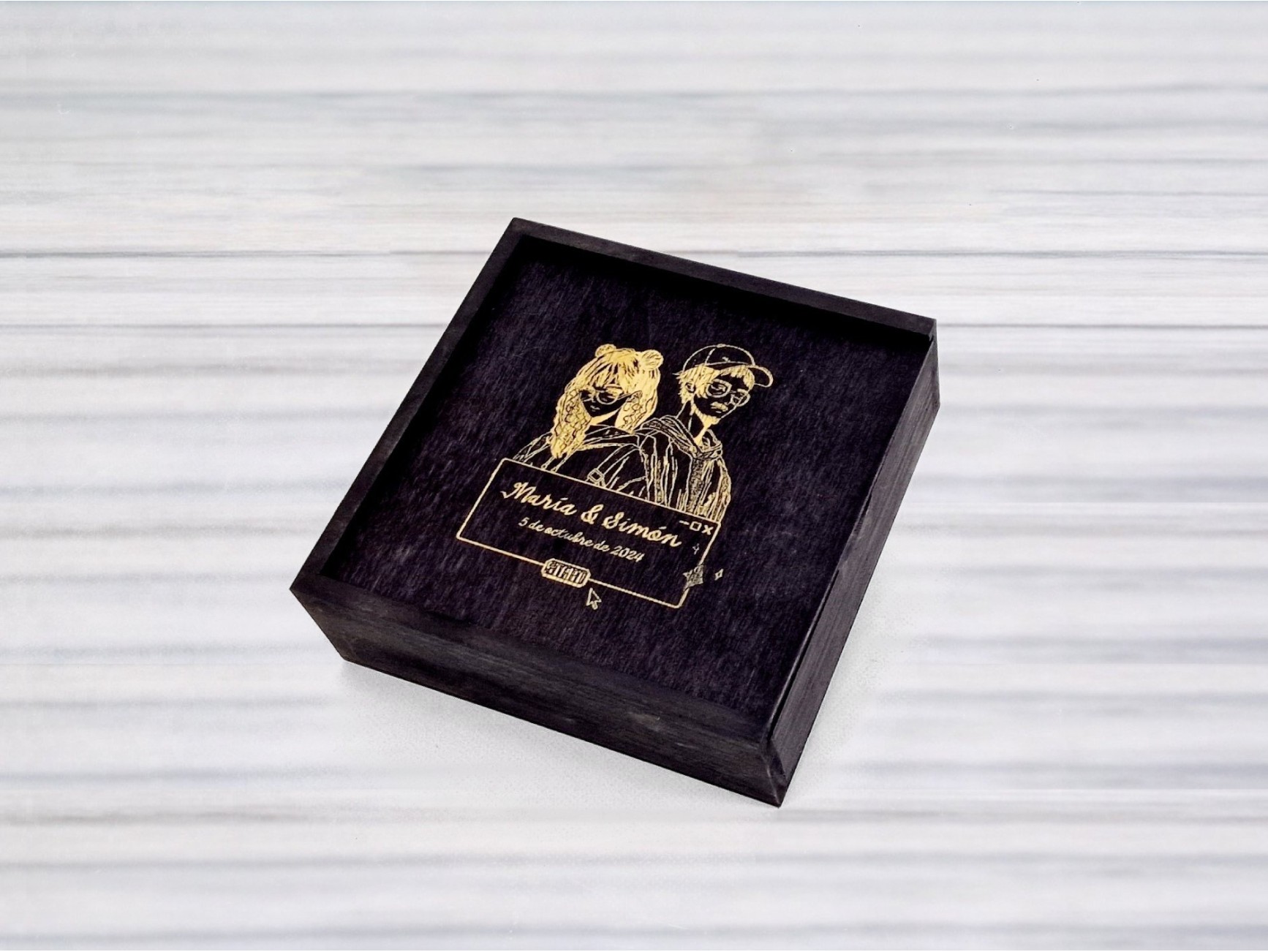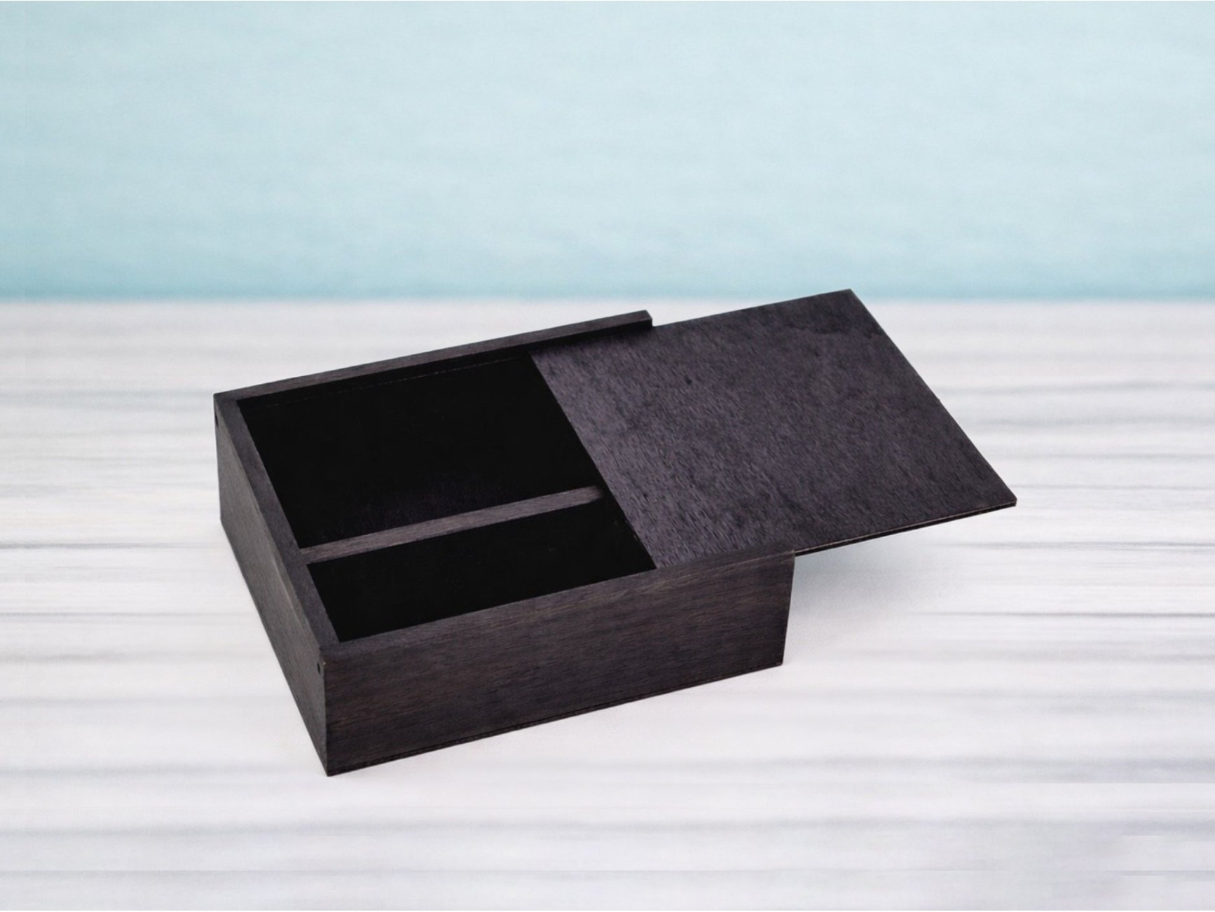 Caja de madera de chopo con tapa corredera para fotos de 10x15. División interior para meter un PenDrive. Ideales para entregar de los trabajos fotográficos..Medidas - Exterior: 22,5x15,5x6 cm. - Interior espacio...