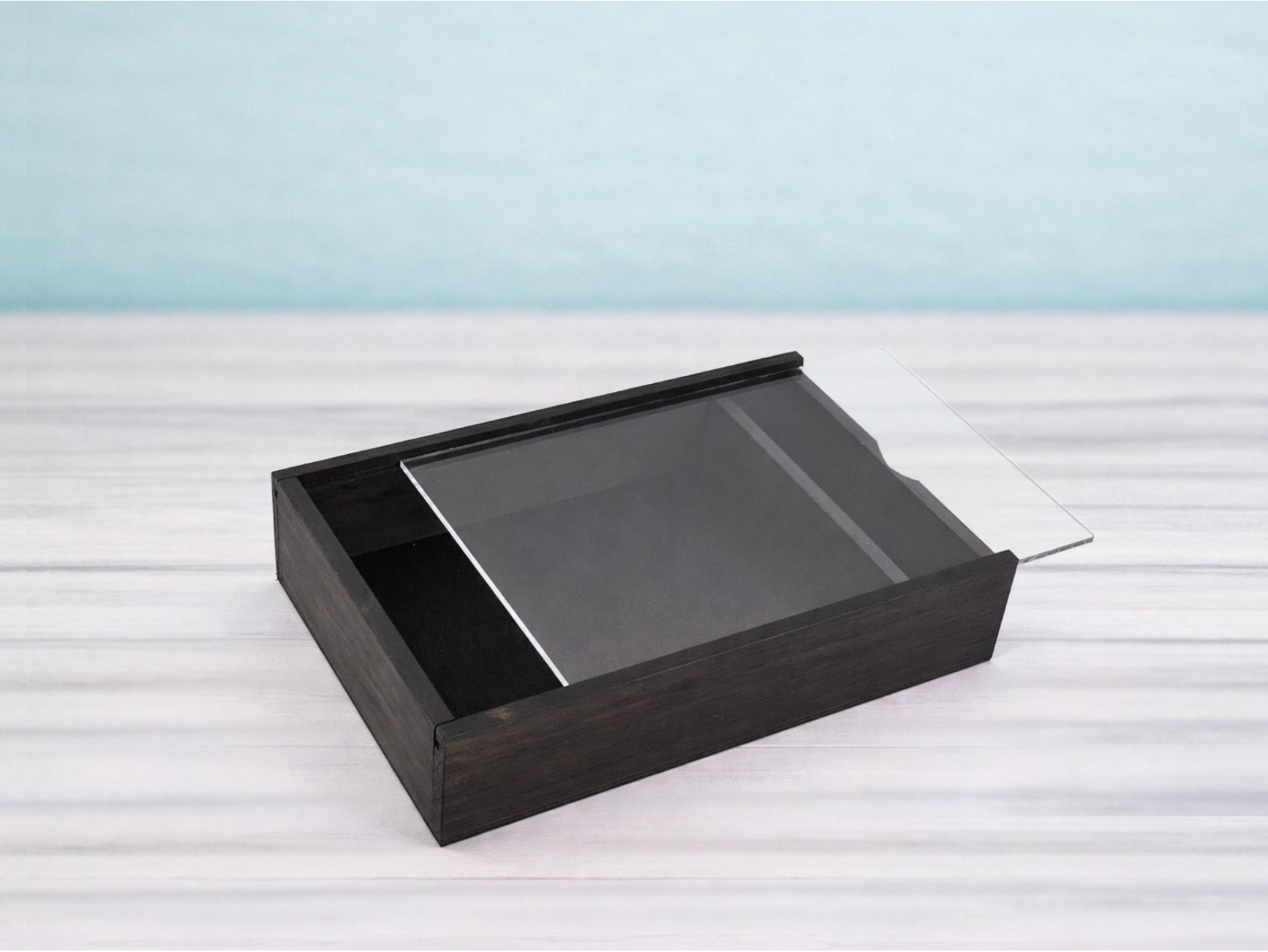 Caja de madera de chopo con tapa corredera para fotos de 10x15. División interior para meter un PenDrive. Ideales para entregar de los trabajos fotográficos..Medidas - Exterior: 22,5x15,5x6 cm. - Interior espacio...