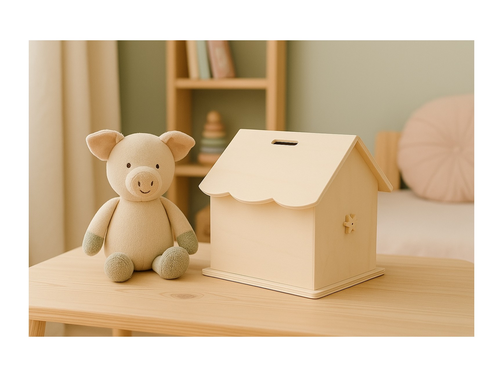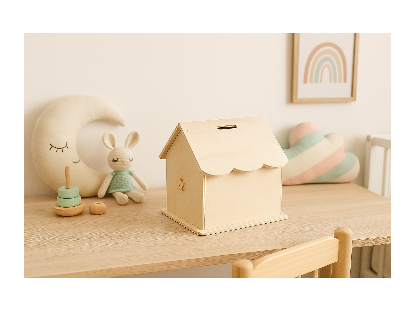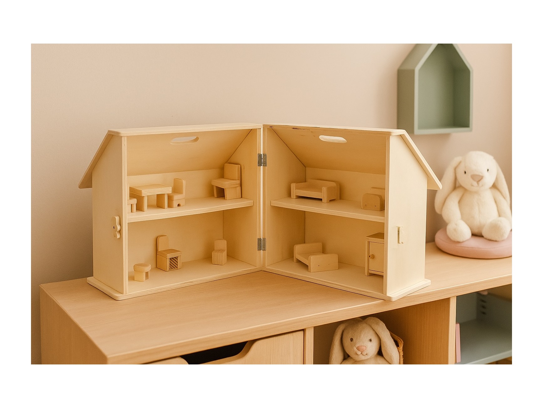 Casa de muñecas de madera natural desplegable y muy manejable. Lleva un asa en el tejado perfecta para transportarla donde quieras. Incluye mueblecitos para hacer de los espacios más coquetos. Todos en chopo para que los más pequeños los puedan pintar como más les guste.