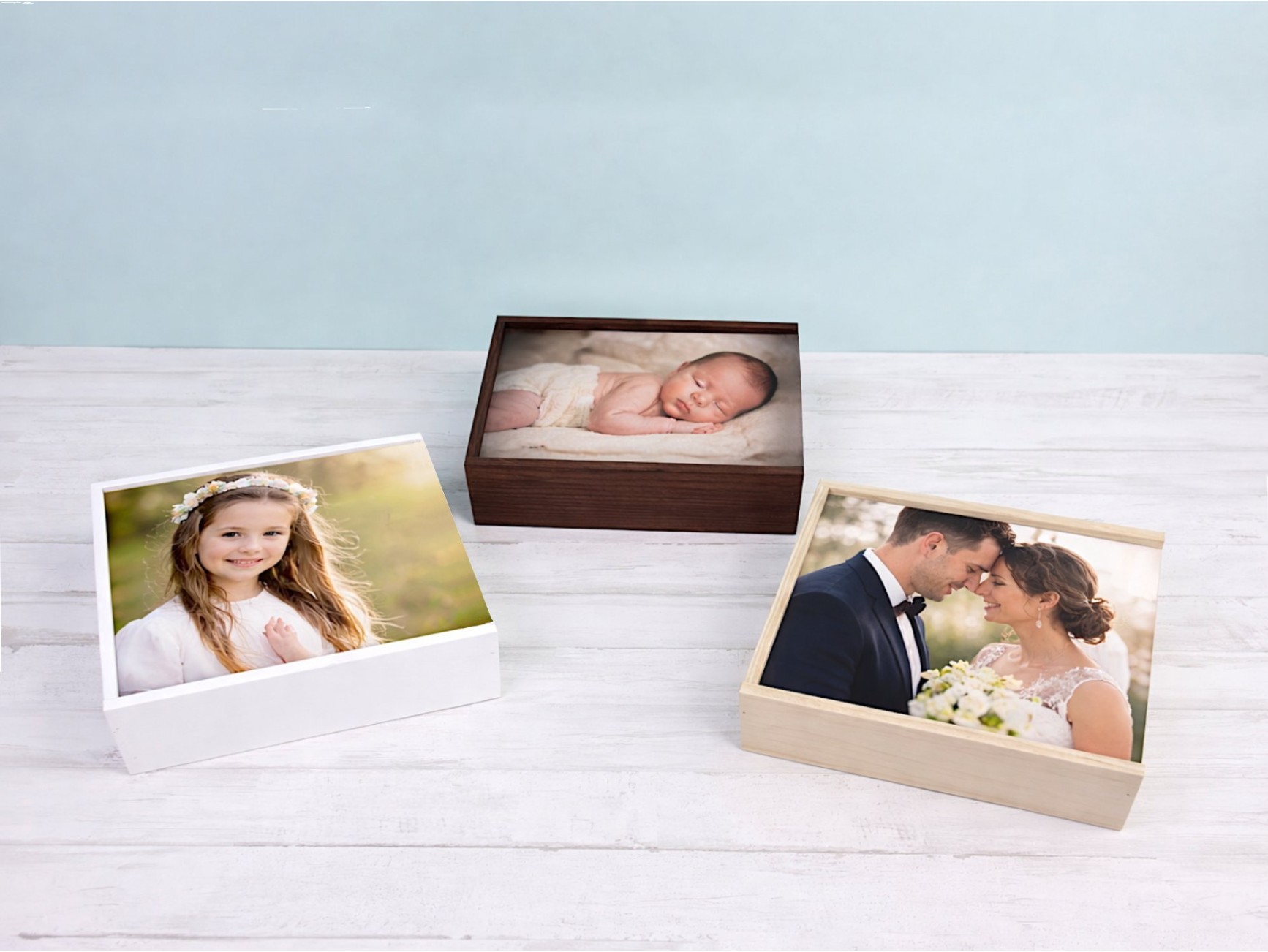 These wooden photo boxes feature a fully customizable lid with full-color direct printing on the wood, where the image covers the entire lid. This printing system allows for vibrant colors and high definition, creating a premium finish that enhances each photograph and transforms the delivery into a special keepsake for the client.