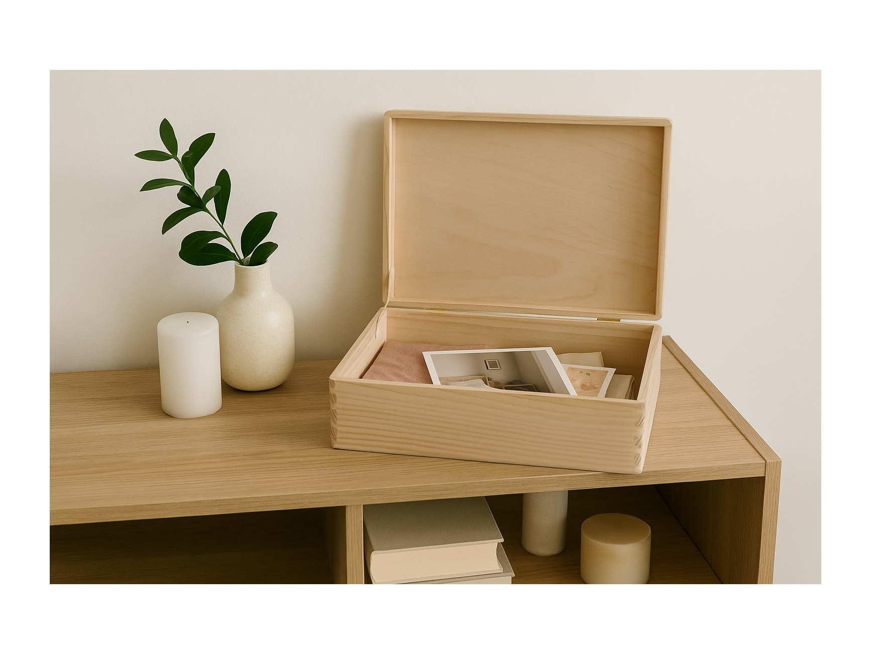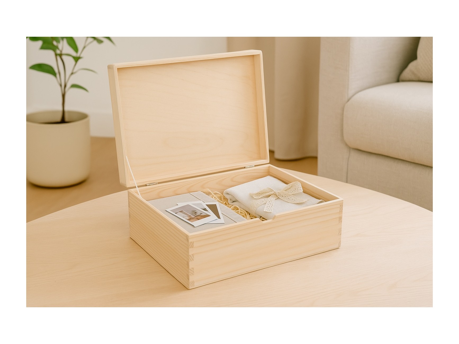 Box made of pine wood with hinges, rounded edges, beveled and tongue-and-groove edges. It has a tape so that the opening of the lid is not complete. It has 2 legs for support.