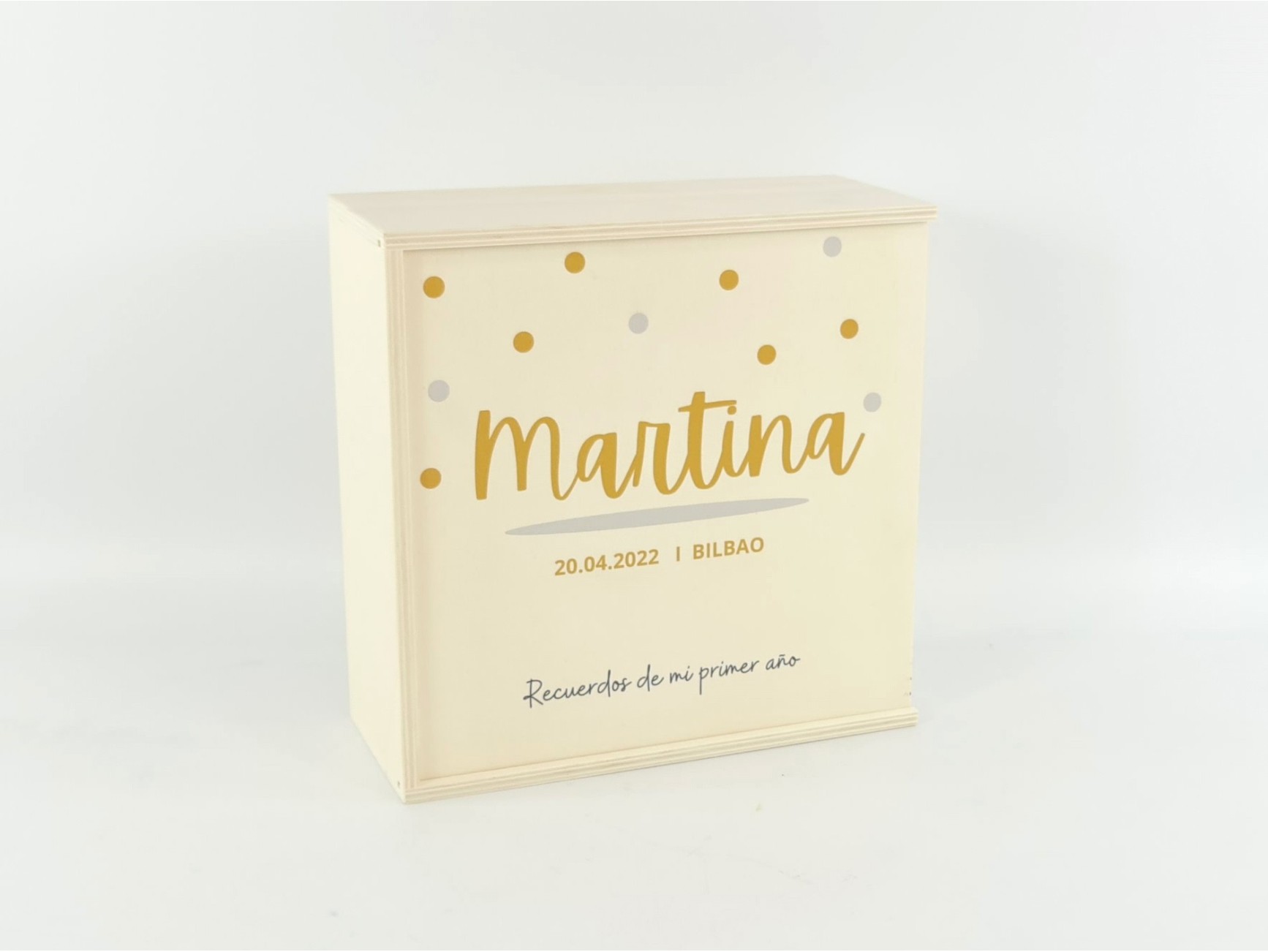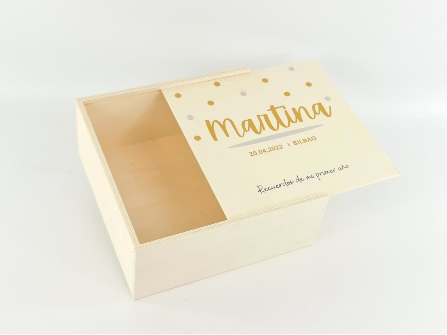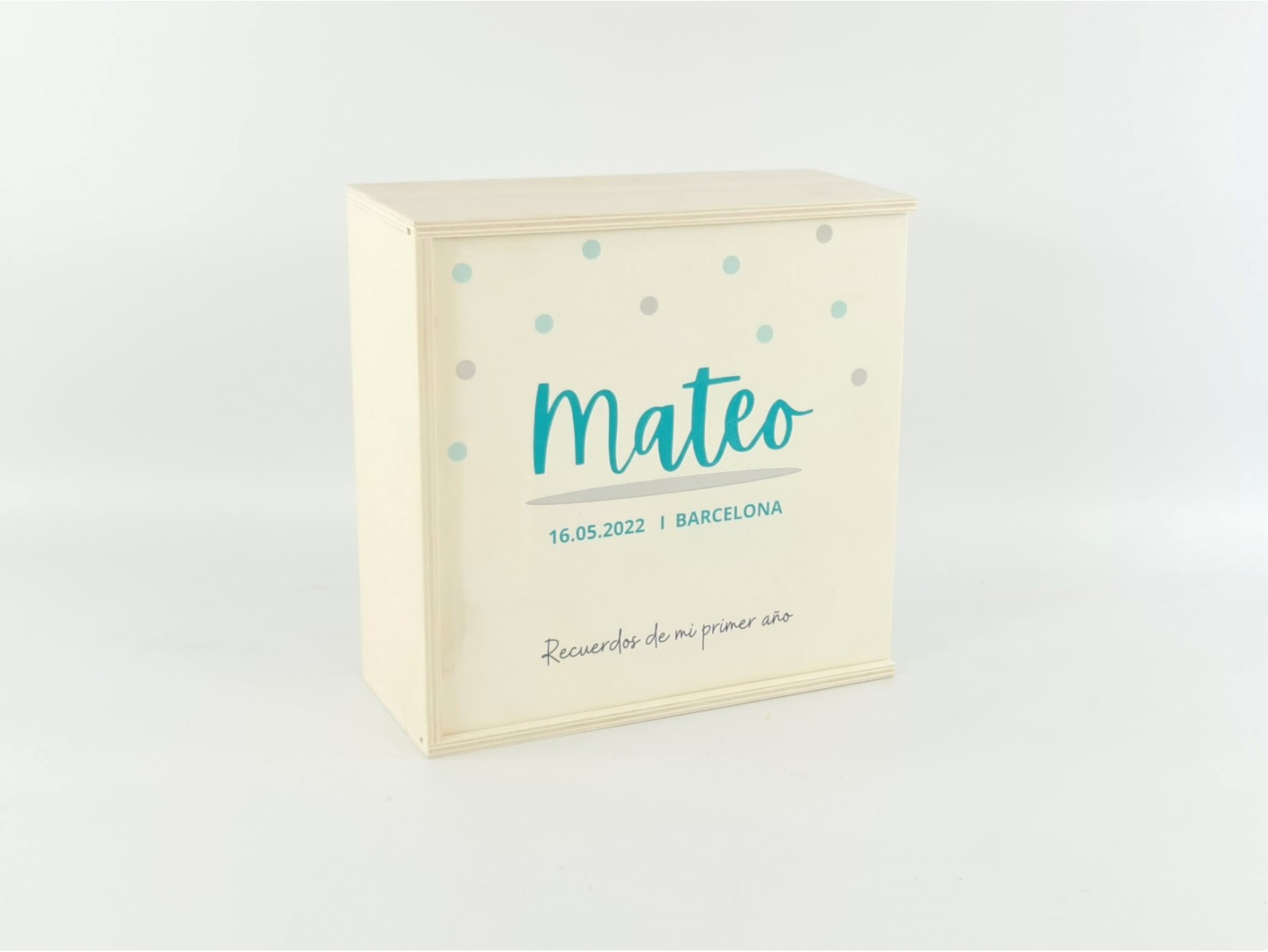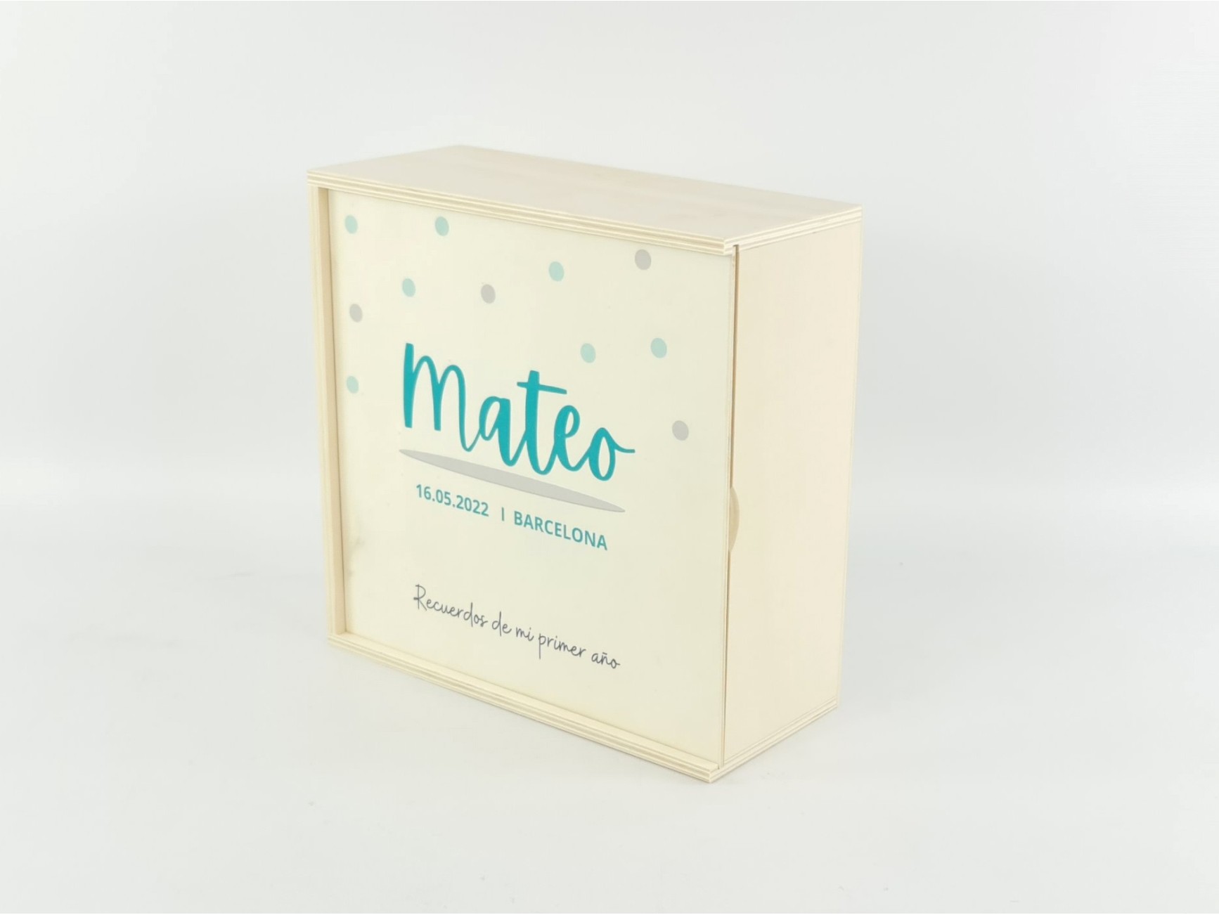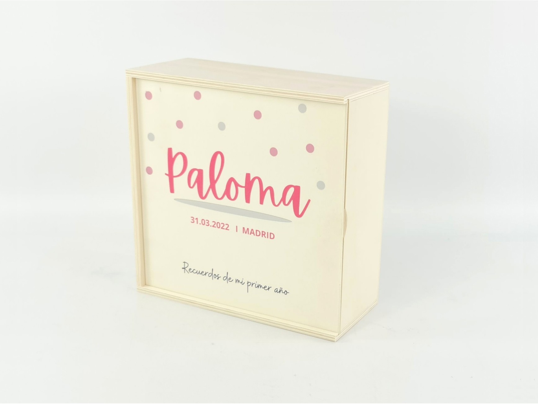 Personalized wooden box in color to store the memories of the baby's first year such as photos, ultrasound, the first tooth or his first change. It is a personalized, unique and very original gift for births.