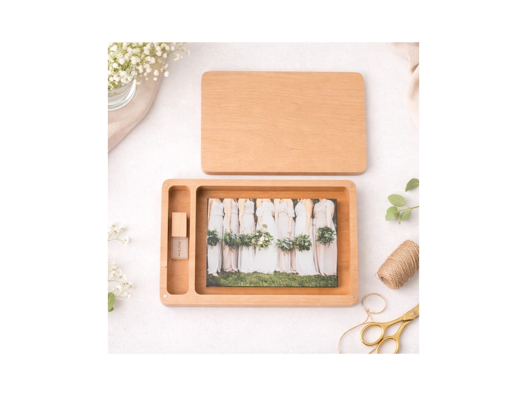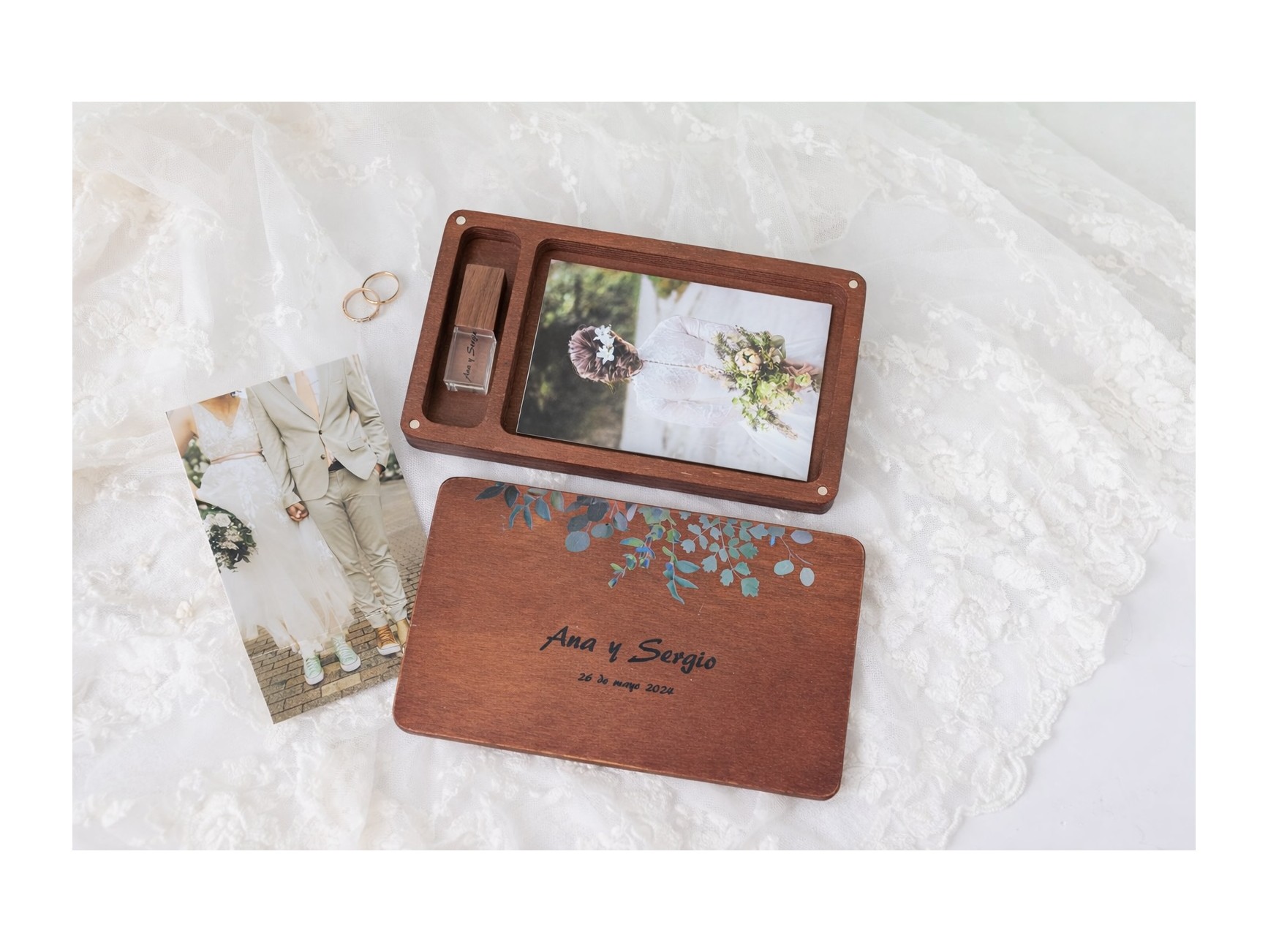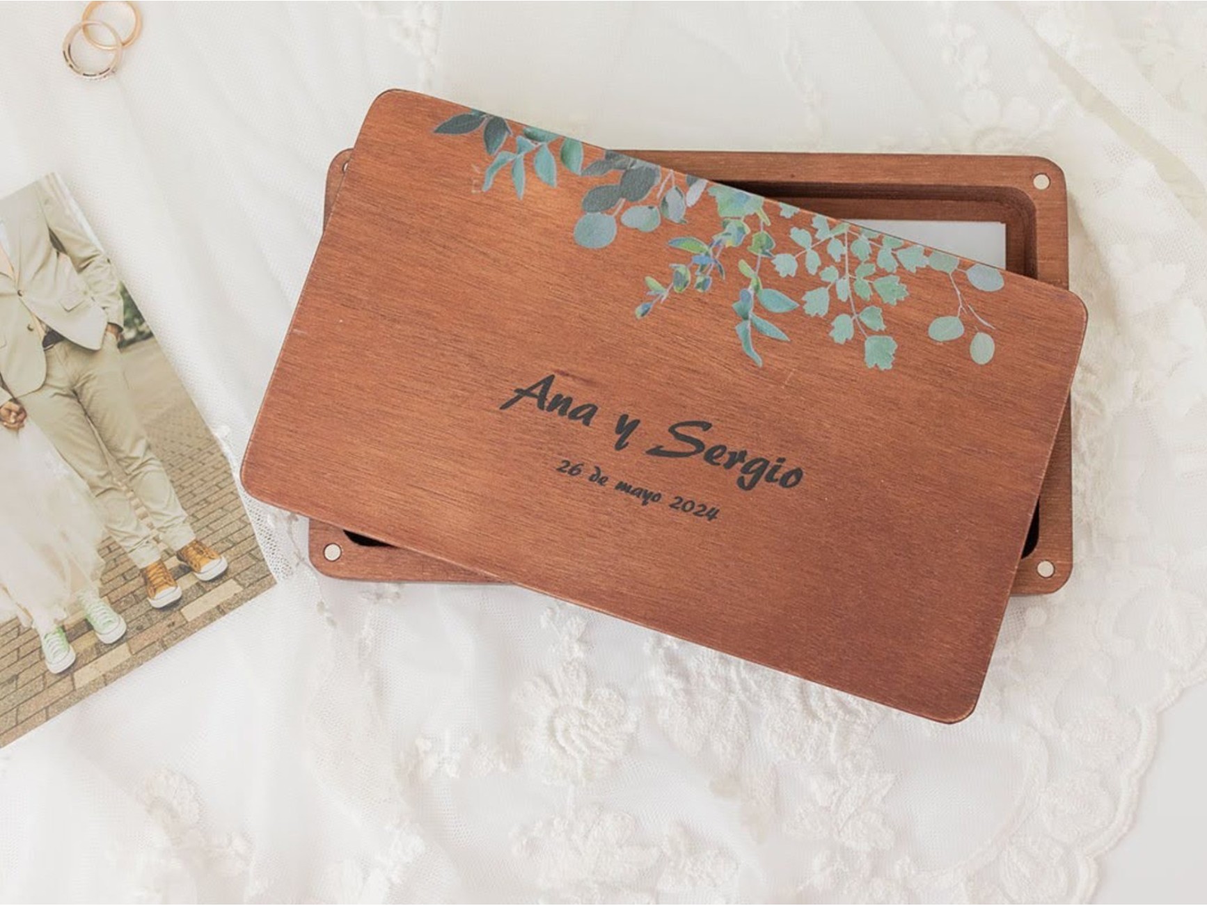 Varnished wooden box with rounded edges and magnets to close them and a hole for photos + Pen drive. We have managed to create a box with a simple but at the same time elegant and different design, fitting well with any style. Surprise your clients by delivering your photo session with these new wooden boxes.