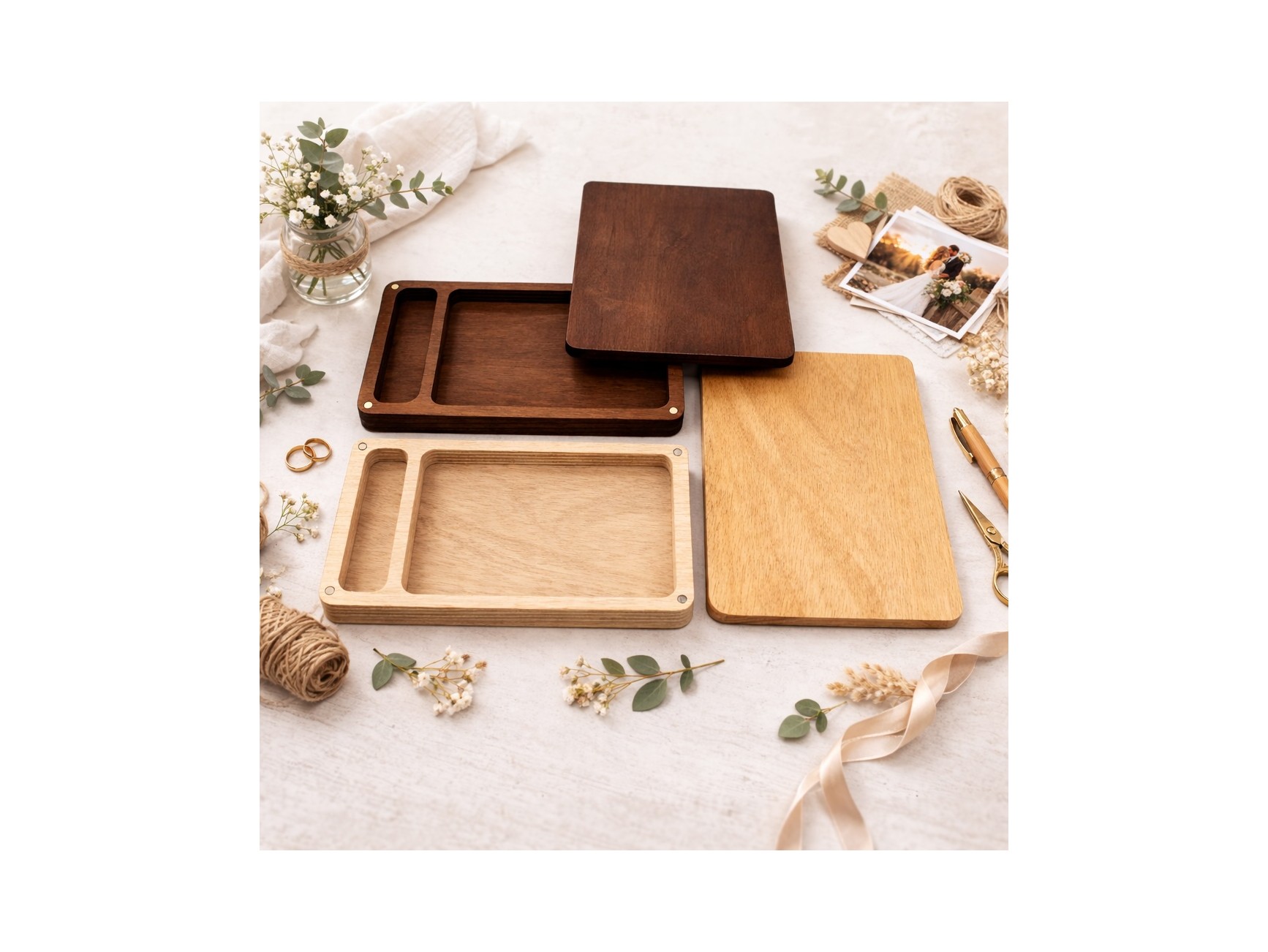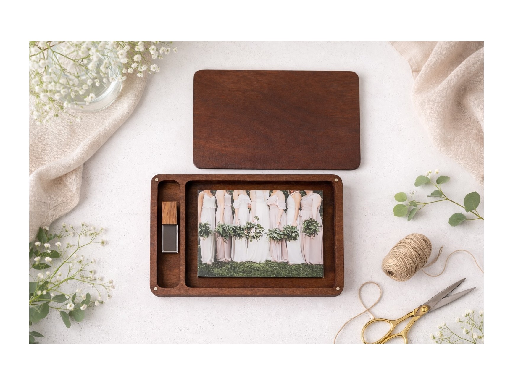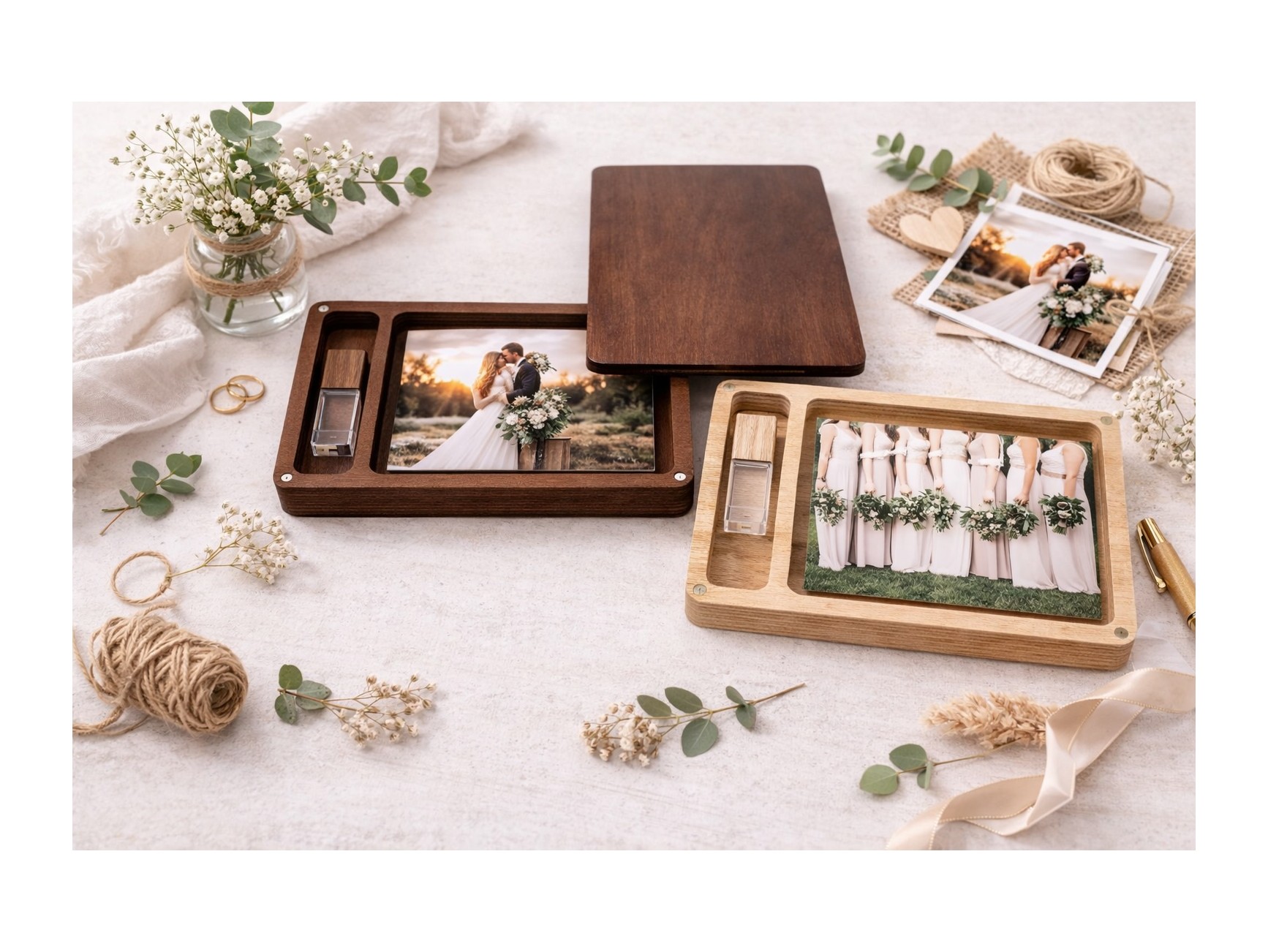 Varnished wooden box with rounded edges and magnets to close them and a hole for photos + Pen drive. We have managed to create a box with a simple but at the same time elegant and different design, fitting well with any style. Surprise your clients by delivering your photo session with these new wooden boxes.