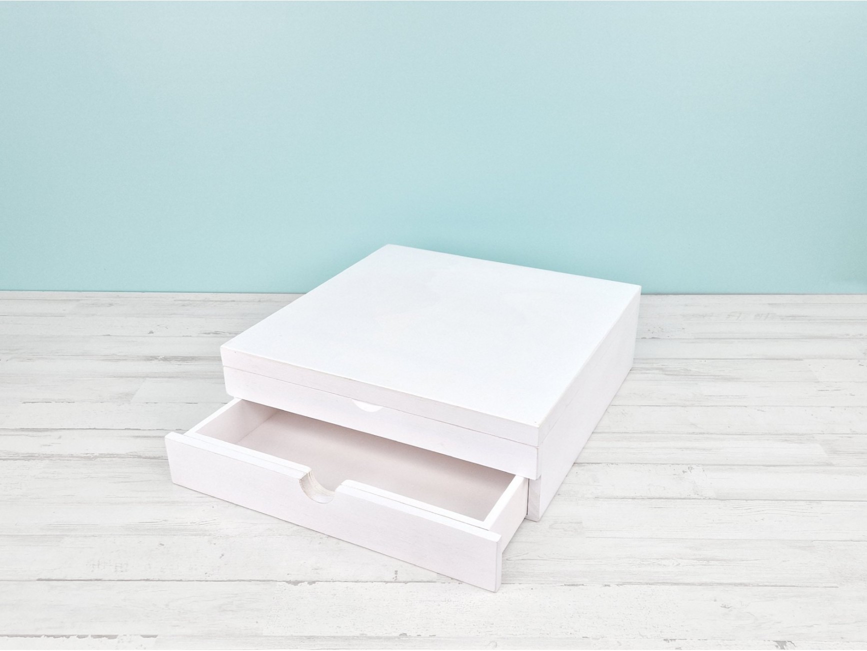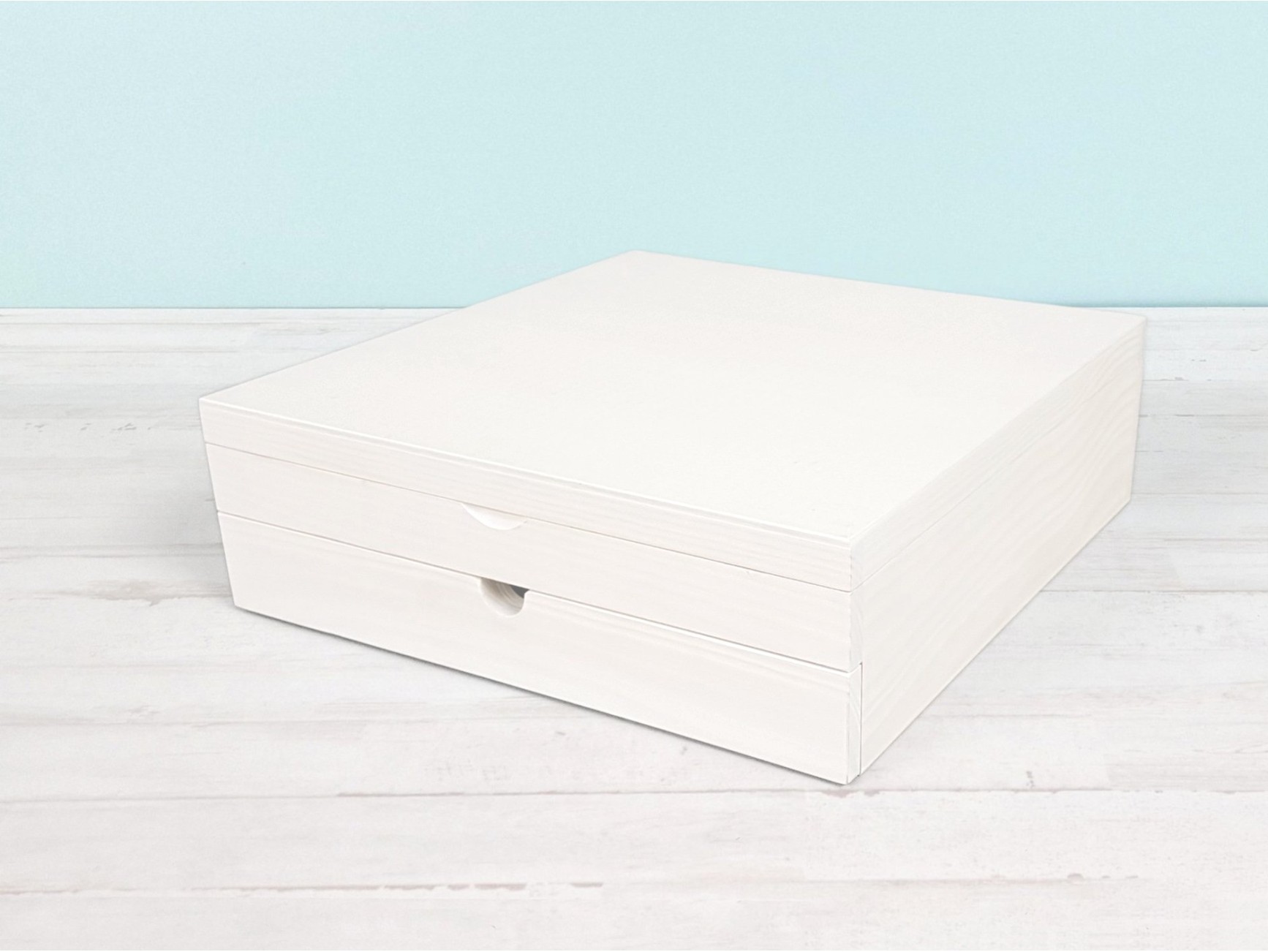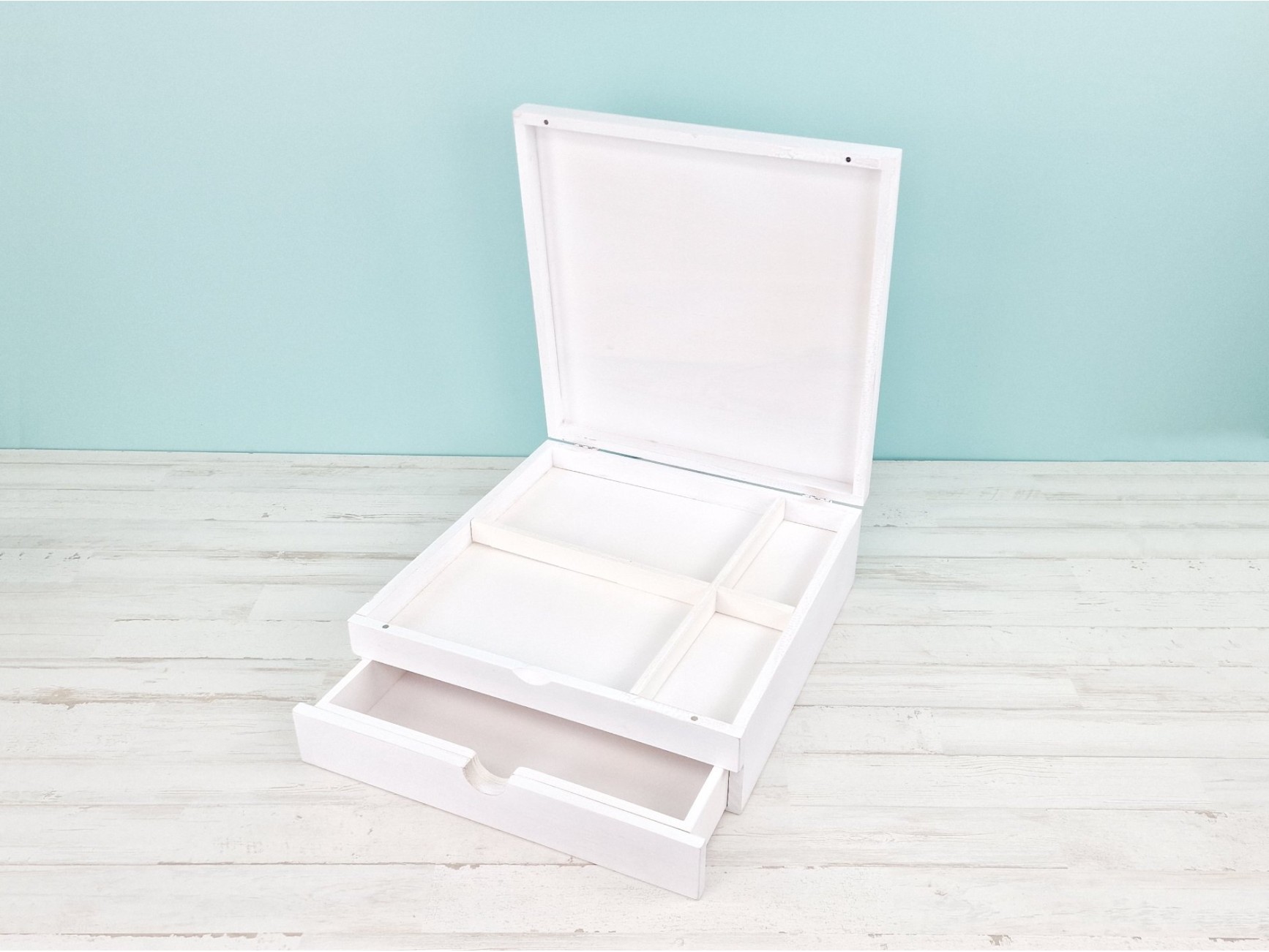 White wooden box with a drawer and removable compartments or dividers. This box boasts an elegant and functional design. It includes a bottom drawer perfect for photo albums, and removable top compartments ideal for storing keepsakes, photos, cards, or small items. A thoughtful and professional presentation for special moments.
