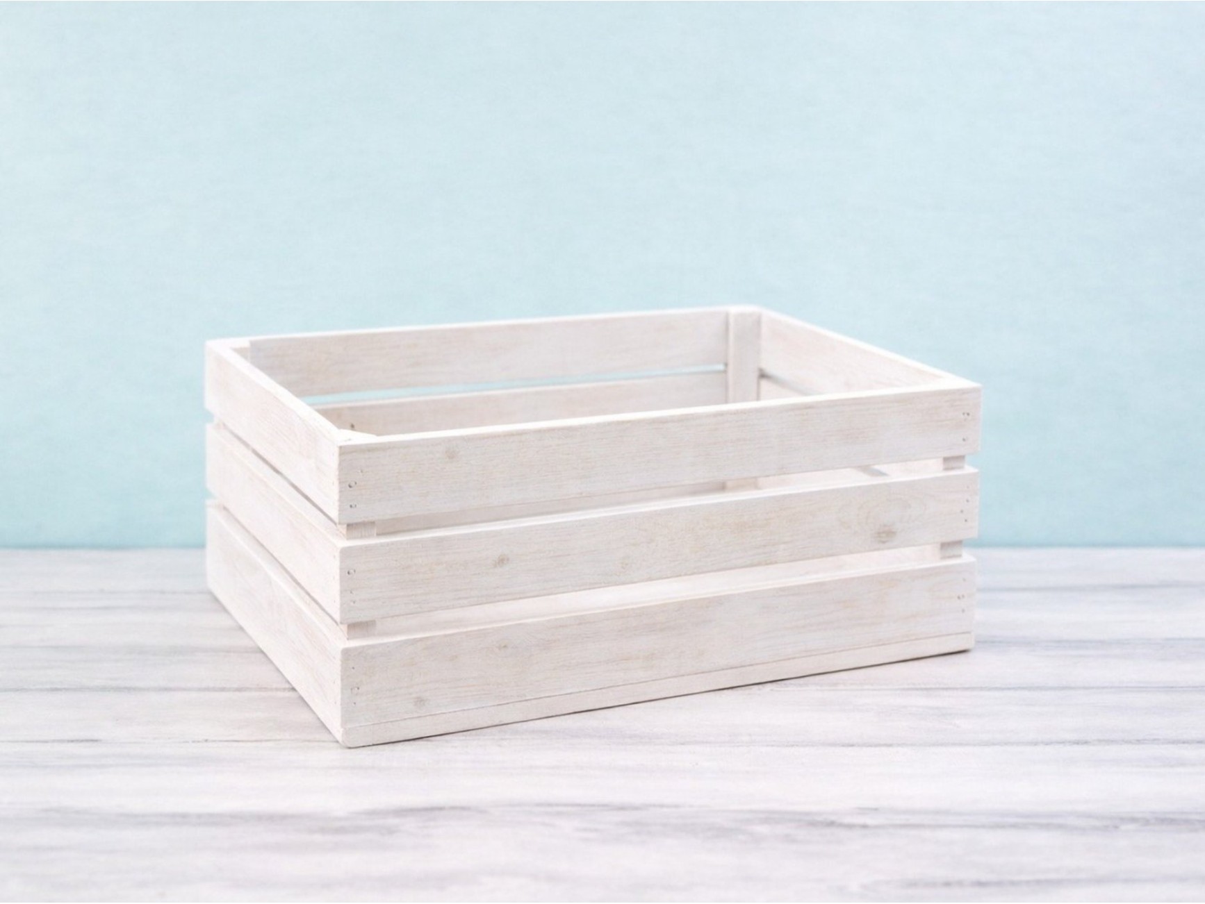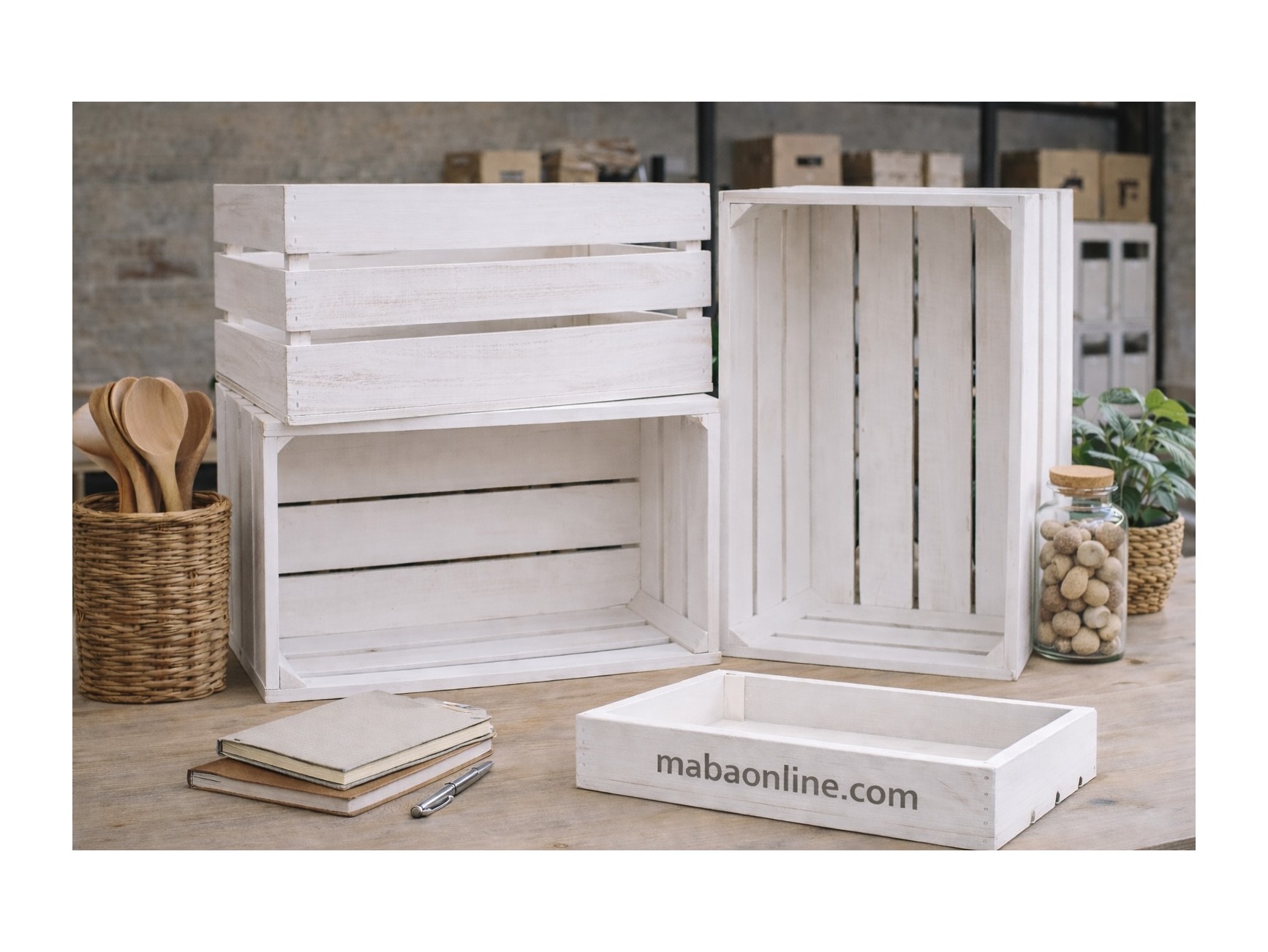 The crates are finished with a coat of white paint, maintaining a natural and light appearance. Due to the inherent characteristics of the wood, the natural grain and nuances of the pine may be visible in some pieces, lending a rustic and authentic style that enhances their decorative appeal.