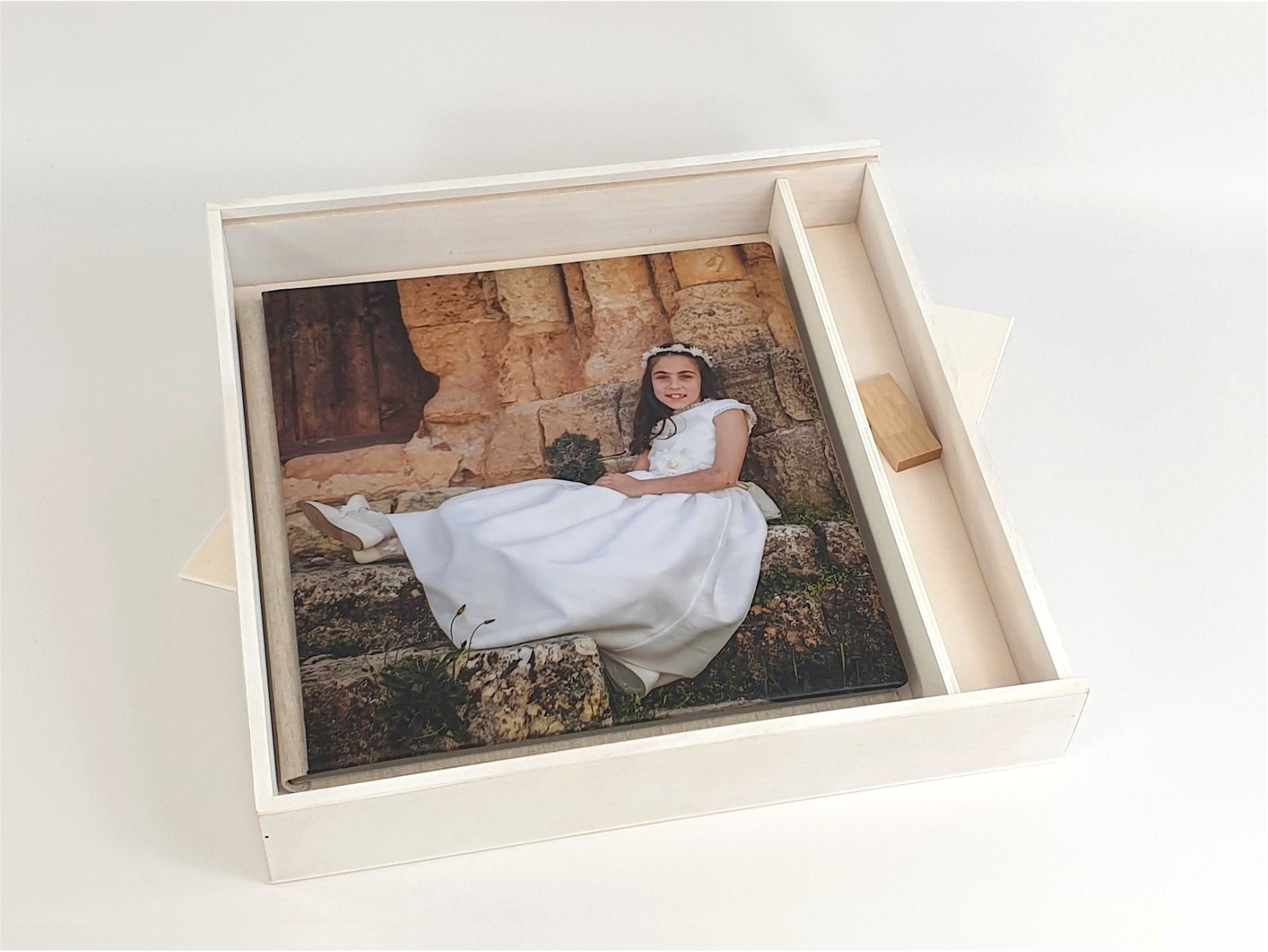 White wooden box, specially designed for 30x30 cm albums. It features a sliding wooden lid and a practical interior divider for storing a USB flash drive, ideal for storing digital copies alongside the physical album.