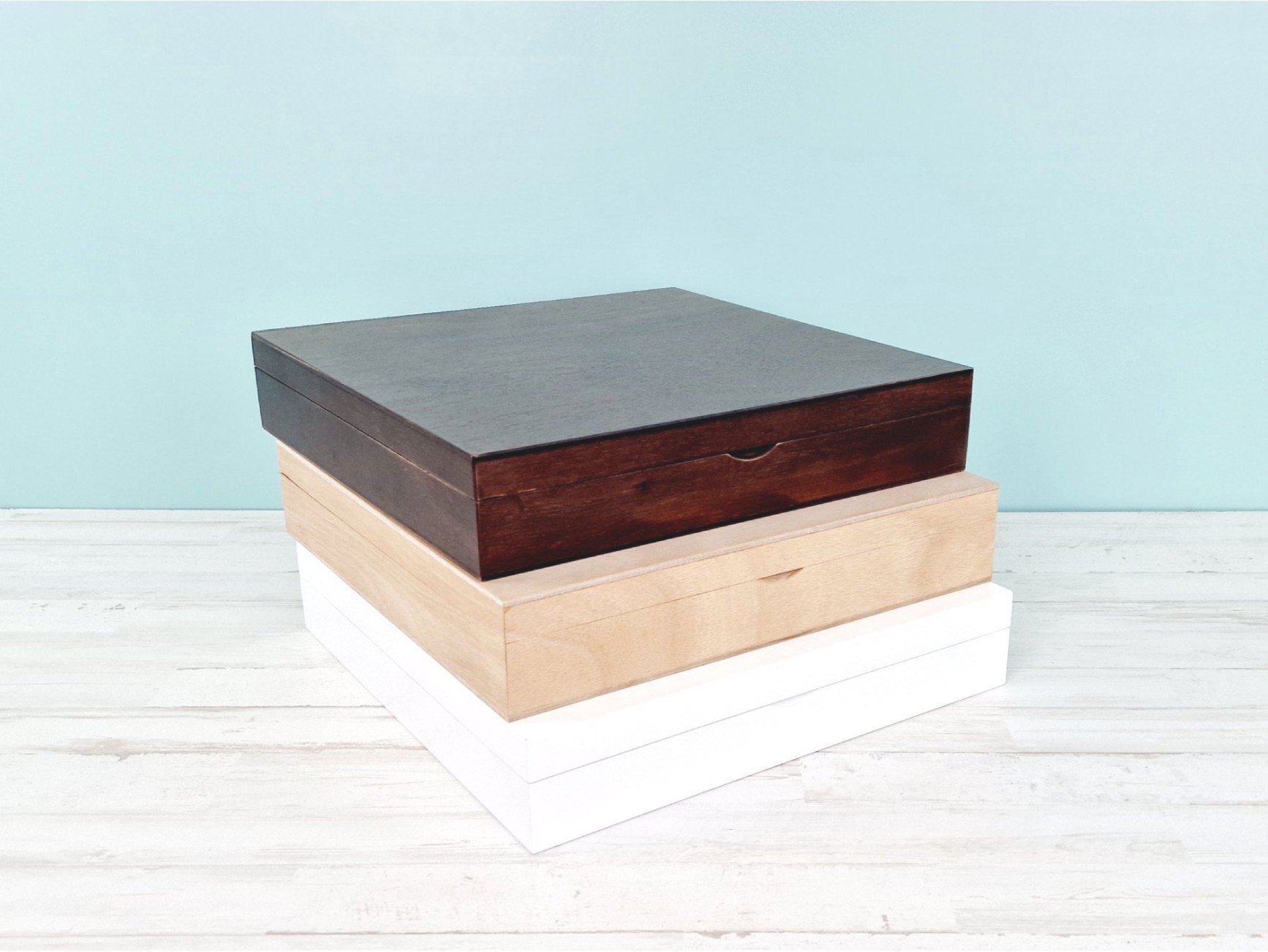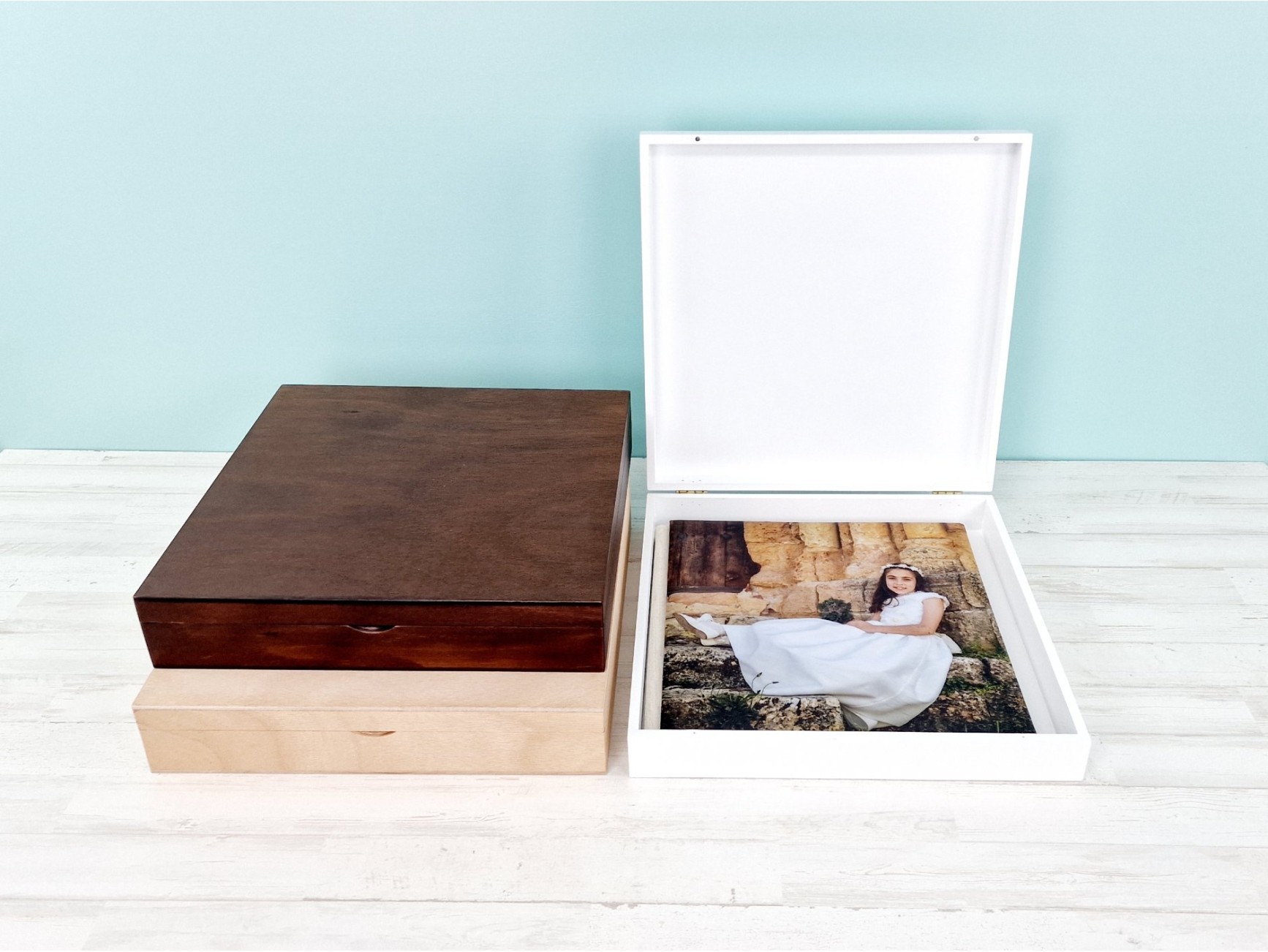Elegant wooden box with hinges and magnetic closure. It's the perfect solution for protecting and presenting your photo album. Thanks to its magnetic closure system, the box closes completely for a discreet and elegant look.