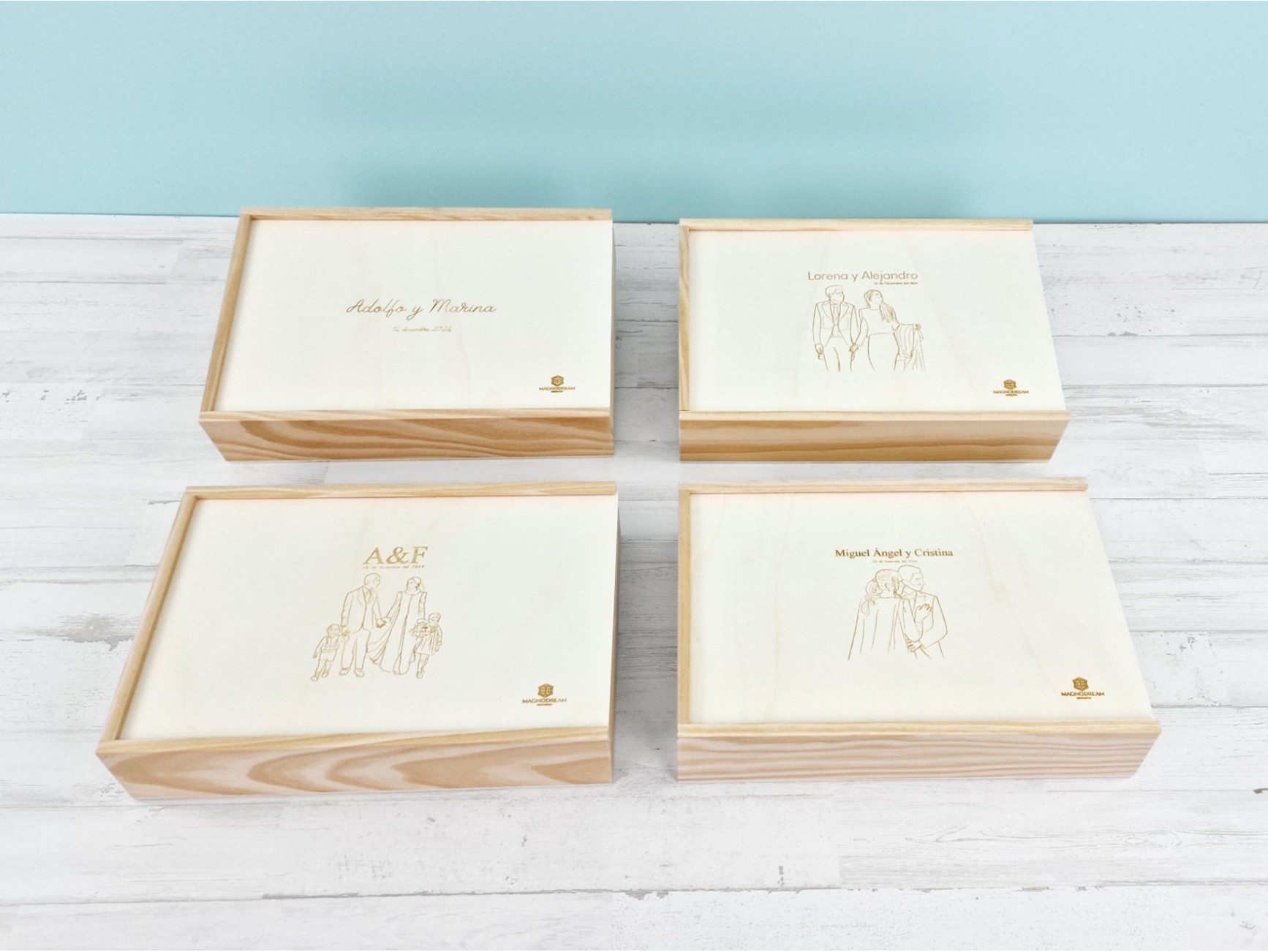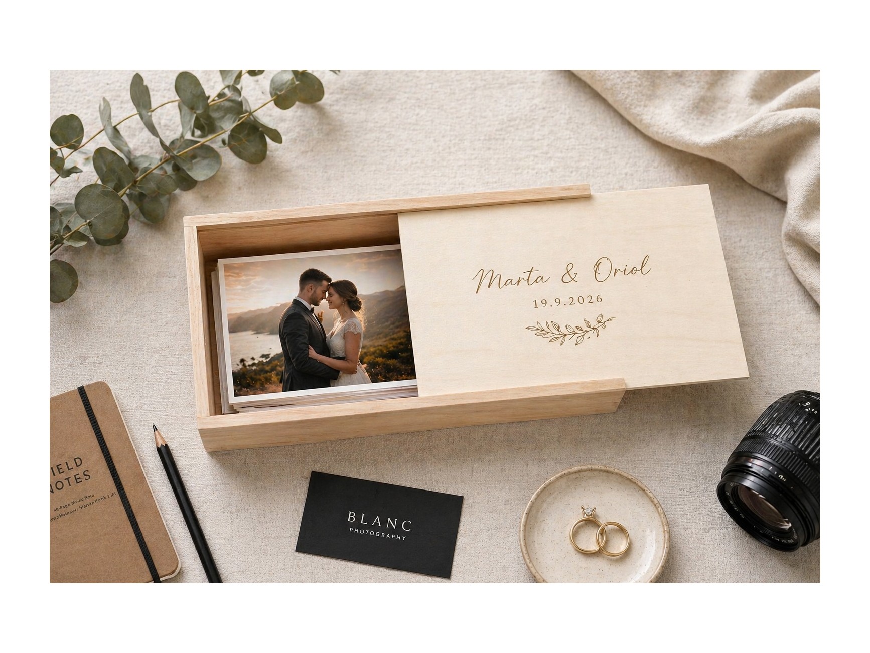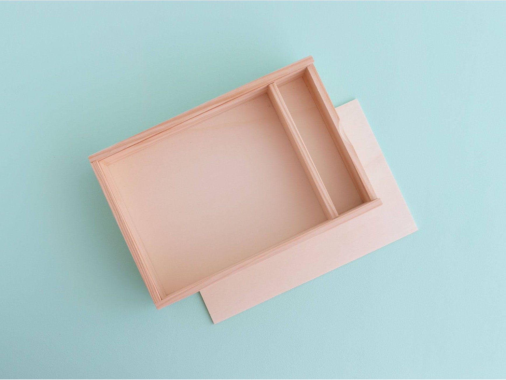A natural wood box with a sliding lid, designed for photographers who want to stand out and turn the delivery of their photo albums into a unique experience.