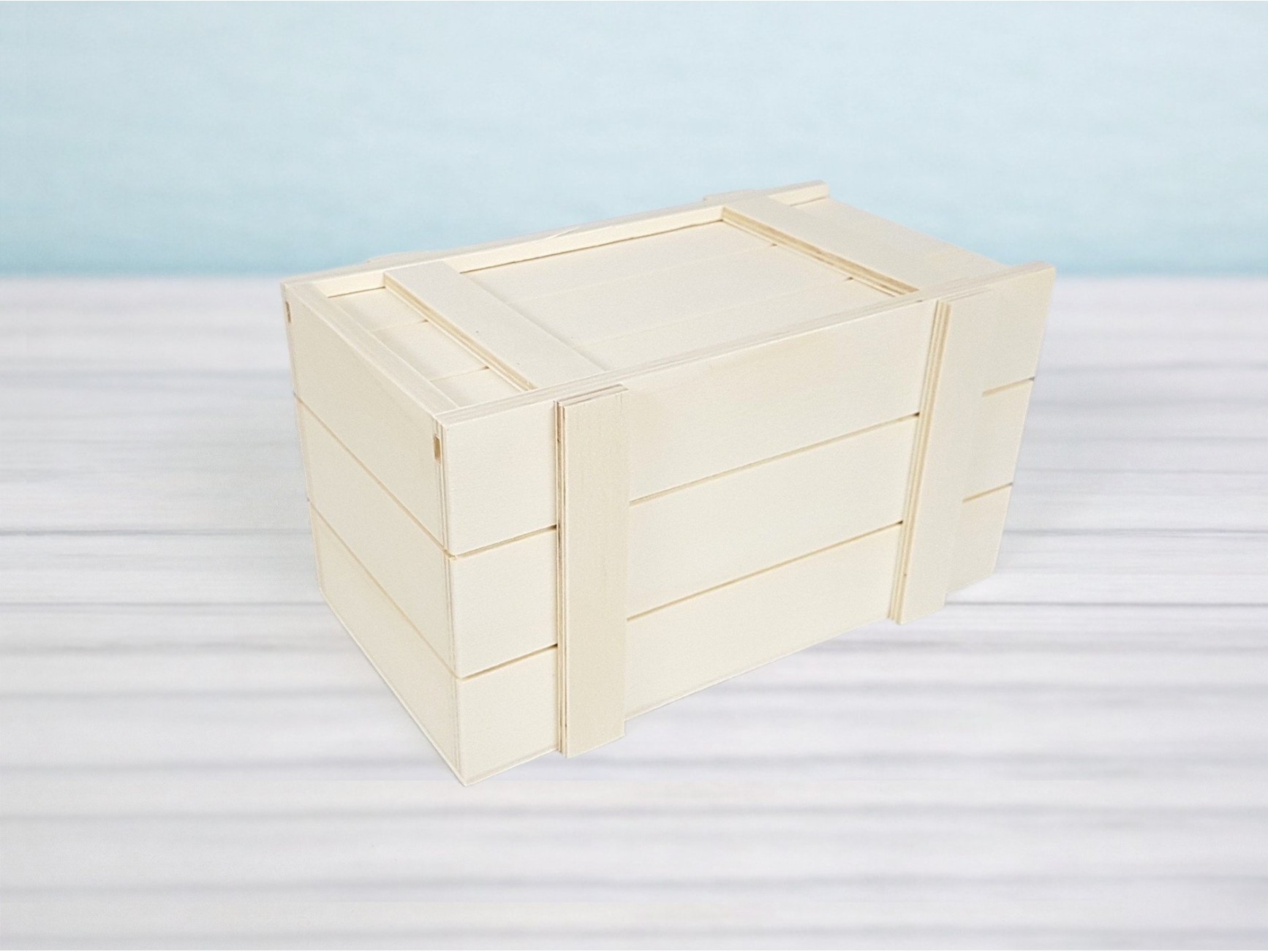Box made of natural pine wood with tongue-and-groove edges, hinges, clasp and 3 removable interior divisions. The size is ideal for a standard whiskey bottle and two glasses. The box can be used as elegant wrapping...