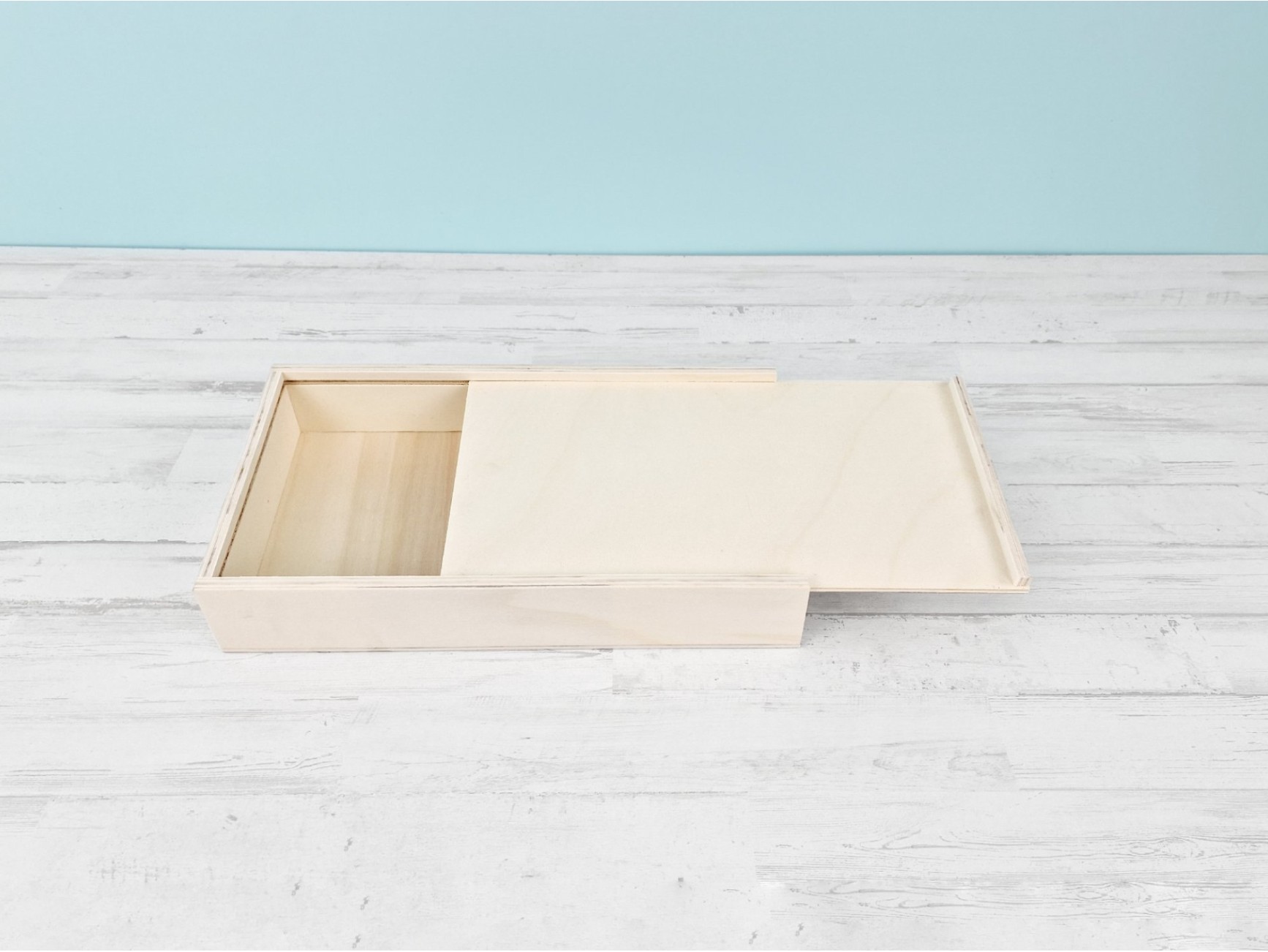 Wooden box with a sliding lid and an outer frame, ideal for personalizing with a logo or brand. Its interior features a compartment that allows you to conveniently organize 20x15 cm photographs along with other keepsakes, such as cards, USB drives, small objects, or special gifts.