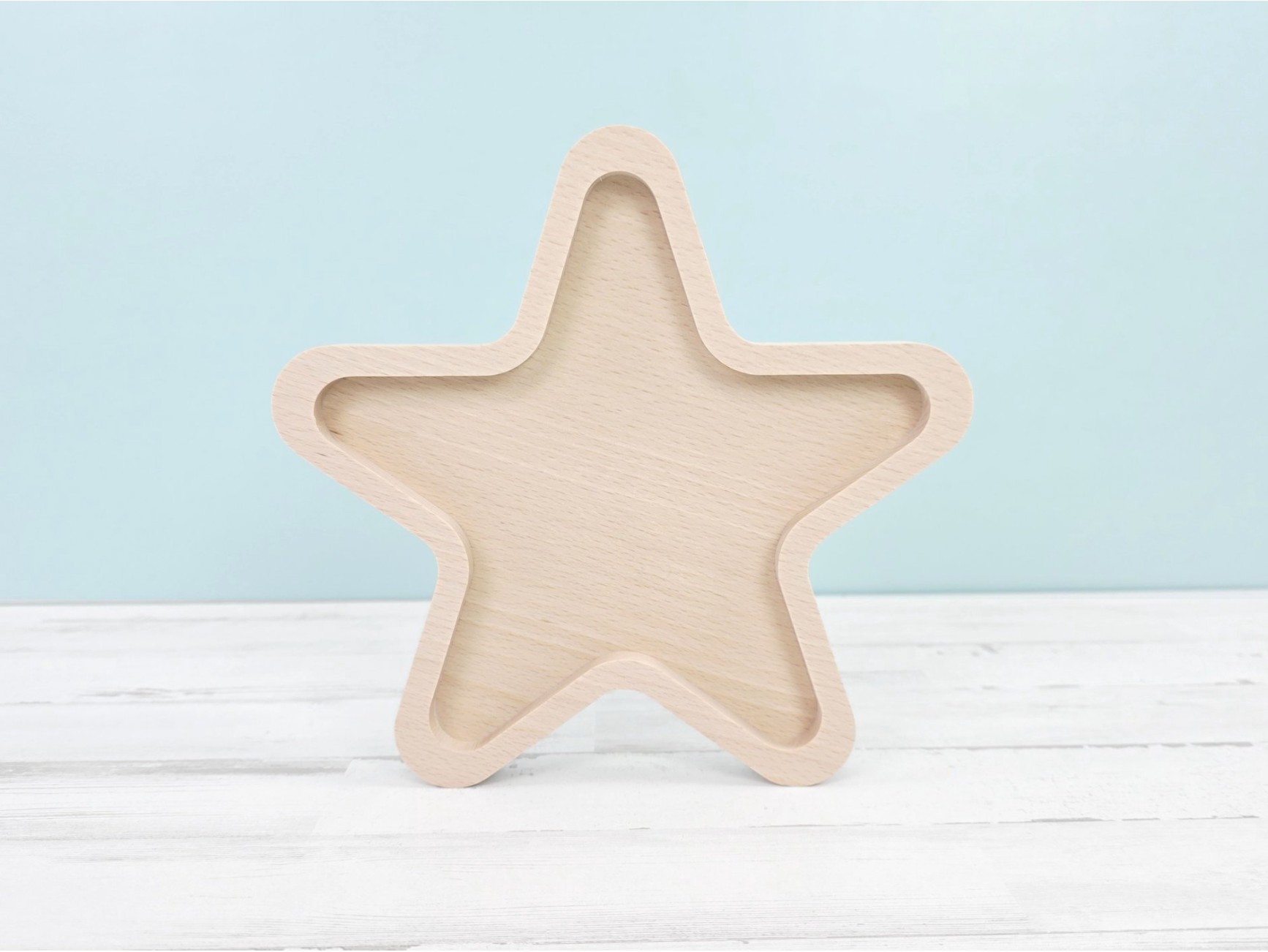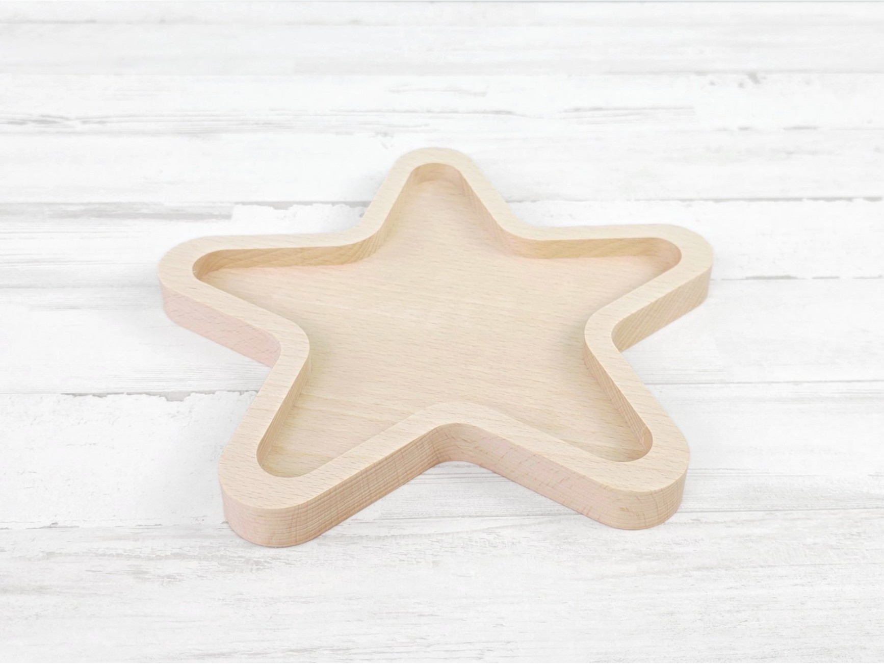 Star-shaped wooden tray made of untreated natural beech wood with a smooth, durable finish, ideal for adding a warm and natural touch to any space.